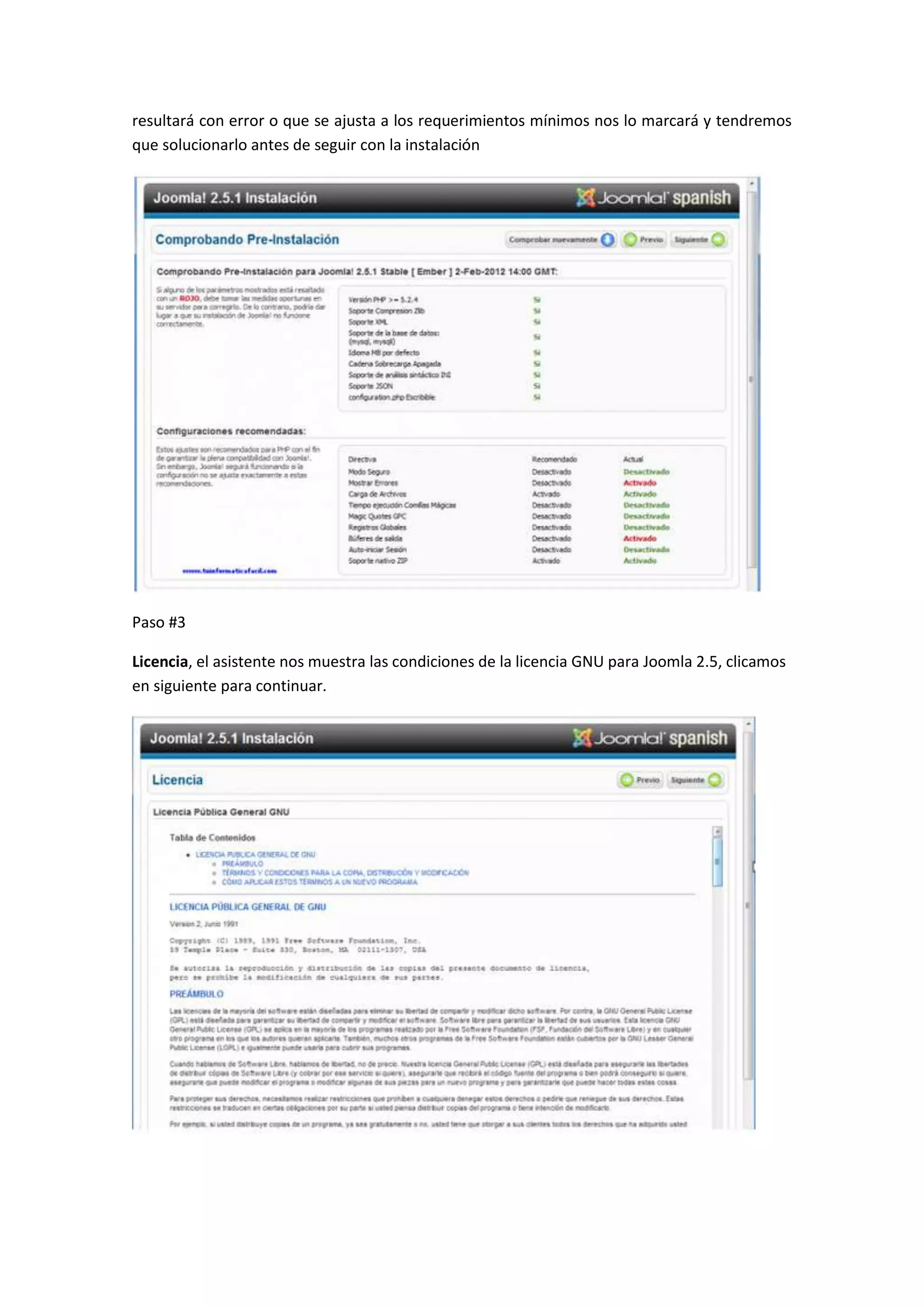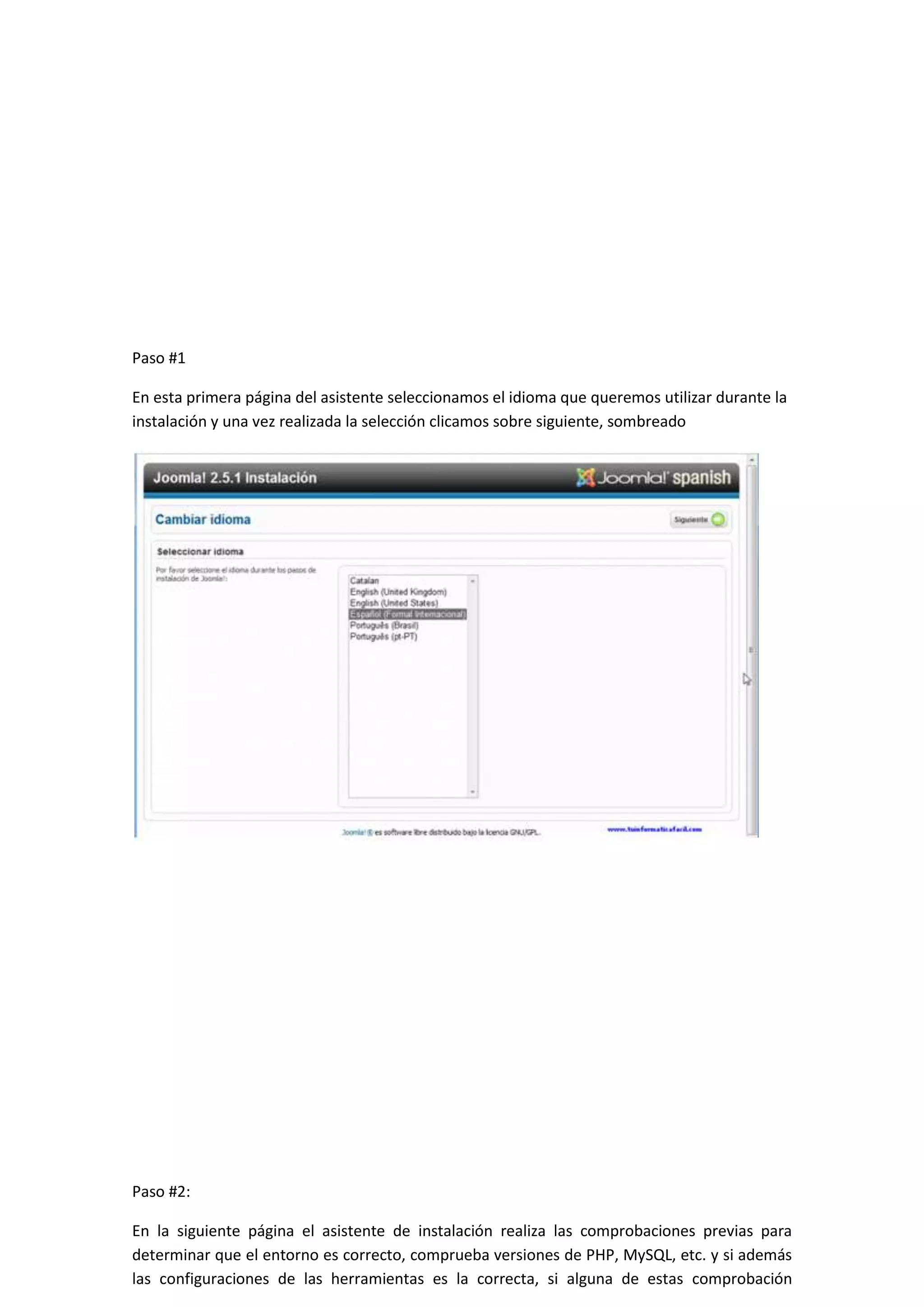 El documento describe los 9 pasos del asistente de instalación de Joomla 2.5, incluyendo seleccionar el idioma, realizar comprobaciones técnicas, aceptar la licencia, configurar la base de datos y el FTP, establecer la configuración principal del sitio, finalizar la instalación eliminando el directorio installation, visualizar el sitio instalado, y acceder al entorno de administración usando el usuario y contraseña administradora.