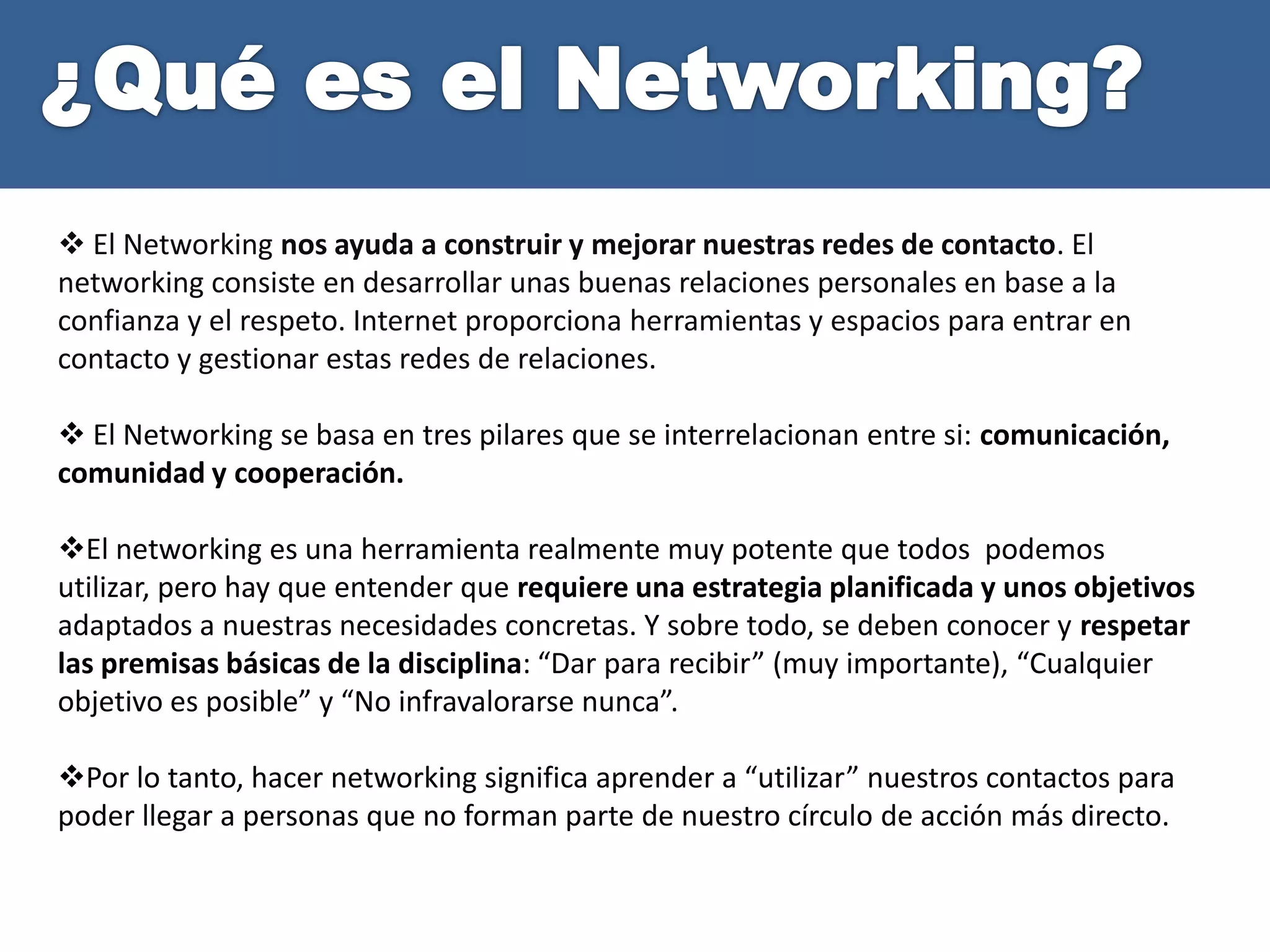 El documento proporciona información sobre el networking profesional y la red social LinkedIn. Explica que el networking se basa en la comunicación, comunidad y cooperación para construir redes de contactos de confianza. LinkedIn permite crear un perfil profesional y conectar con otros usuarios para encontrar oportunidades laborales, compartir conocimiento y ampliar la red de contactos. El documento ofrece consejos sobre cómo optimizar el perfil y participar en grupos para sacar el máximo provecho a esta herramienta.