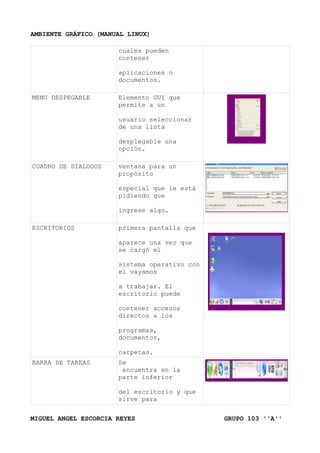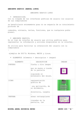 Este documento describe los elementos básicos de una interfaz gráfica de usuario (GUI) en Linux, incluyendo el puntero, iconos, ventanas, menús desplegables, cuadros de diálogo, escritorios, barras de tareas, iconos de grupos y botones de inicio. Explica que una GUI utiliza gráficos para facilitar la interacción del usuario con la computadora de una manera más sencilla que las interfaces basadas solo en texto y comandos.