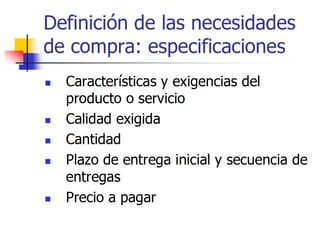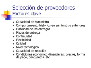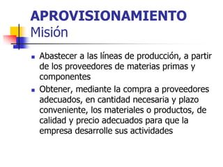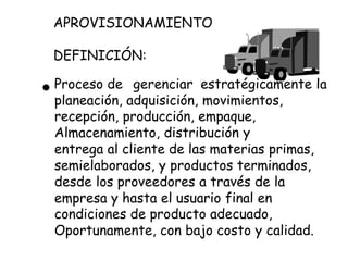 El documento proporciona una definición de logística de aprovisionamiento y describe sus objetivos principales, como mantener la continuidad operativa, garantizar la calidad de los materiales y mejorar los niveles de inventario. También resume los procesos clave de la logística de aprovisionamiento, incluido el cálculo de necesidades, la compra, la obtención y el almacenamiento de los materiales desde los proveedores hasta la empresa. Además, destaca la importancia de seleccionar proveedores a través de criterios como el precio,