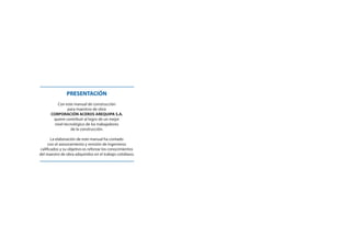Este manual proporciona información sobre la construcción de viviendas de albañilería confinada. Explica que este tipo de construcción utiliza ladrillos, columnas y vigas de concreto. Describe los elementos estructurales clave como cimientos, muros portantes y techos, y cómo estos trabajan juntos para soportar las cargas y fuerzas sísmicas. También brinda recomendaciones sobre el diseño estructural y la densidad adecuada de muros para resistir terremotos.