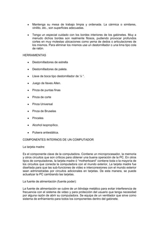 El documento proporciona información sobre el mantenimiento de una computadora personal (PC), incluyendo consejos sobre limpieza, herramientas necesarias, y descripciones de los componentes internos y externos de un PC. Explica cómo documentar el desarmado de un PC, limpiar componentes internos como la tarjeta madre y la fuente de alimentación, y habla sobre fallas comunes después de un mantenimiento preventivo como la reinicialización del disco duro o la reinstalación de software.
