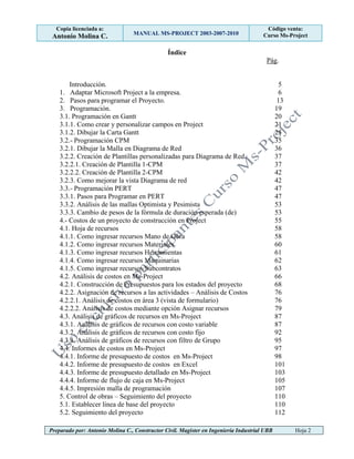 Este documento presenta un manual sobre el uso de Microsoft Project aplicado a proyectos de construcción. Explica cómo adaptar el software a la empresa, los pasos para programar un proyecto, la programación en diagramas Gantt, CPM y PERT, el análisis de costos, el control y seguimiento del proyecto, e incluye ejemplos prácticos. El manual está dirigido principalmente a estudiantes y profesionales de la construcción.