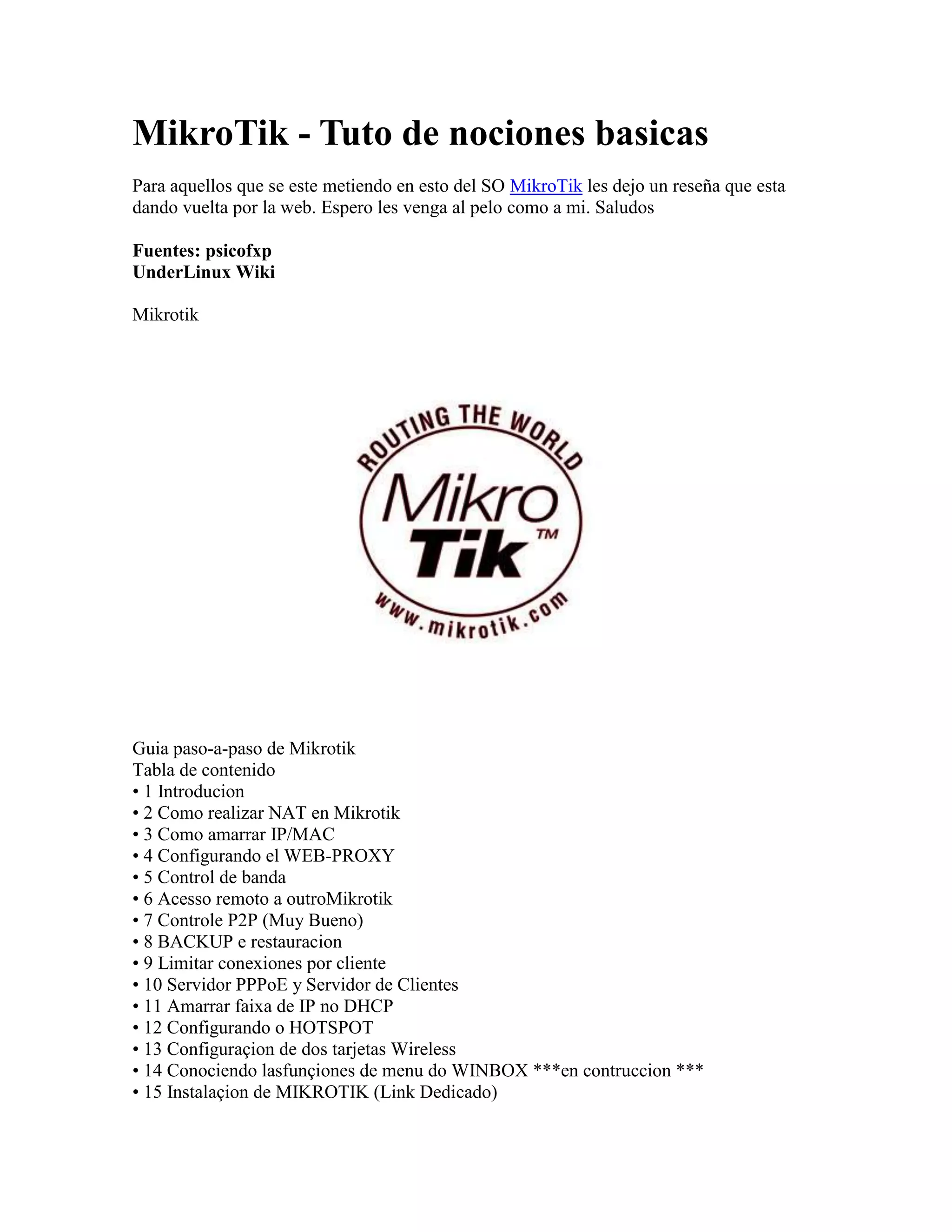 Este documento proporciona una guía paso a paso para configurar varias funciones en MikroTik, incluyendo NAT, amarrar IP/MAC, configurar un proxy web, control de ancho de banda, acceso remoto, control P2P, copias de seguridad y restauración, limitar conexiones por cliente, servidor PPPoE y servidor de clientes. La guía explica cada configuración con instrucciones claras y capturas de pantalla.