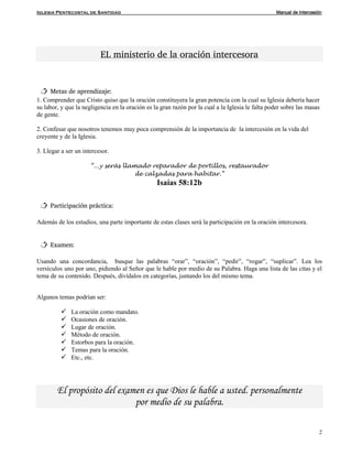 Este documento presenta un manual de intercesión de la Iglesia Pentecostal de Santidad. En la primera lección, se discuten los principios para el crecimiento espiritual necesario para ser un intercesor efectivo, como la entrega total a Dios y la necesidad de una vida santa. La segunda lección explica que la iglesia debe pronunciar la voluntad de Dios y orar en armonía, como se enseña en el Padre Nuestro. La tercera lección presenta principios como mantener el corazón limpio y depender del Espírit