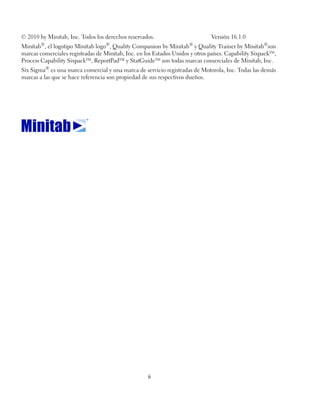 Este documento proporciona una introducción al software estadístico Minitab. Incluye información sobre los derechos de autor de Minitab, una tabla de contenido que enumera los capítulos sobre gráficos de datos, análisis estadístico, calidad y diseño de experimentos, y breves descripciones de cada capítulo. El documento proporciona instrucciones sobre cómo utilizar las principales funciones de Minitab.