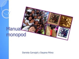 El documento presenta un manual de uso para un monopod diseñado para facilitar la toma de selfies. Explica que el monopod es un bastón con Bluetooth que se conecta al celular para controlar la cámara de forma remota. Detalla las partes internas y externas, el proceso de encendido del Bluetooth, la instalación del celular en el soporte y los pasos para tomar una selfie usando los botones del monopod.