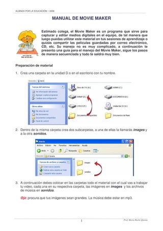 Este documento proporciona instrucciones paso a paso para usar el programa Movie Maker, incluyendo cómo importar imágenes y audio, agregarlos a la línea de tiempo, agregar títulos, transiciones y guardar el video final. Explica cada etapa del proceso de edición de video, como preparar los archivos multimedia, importarlos al programa, editar la línea de tiempo, agregar efectos y guardar el proyecto terminado.