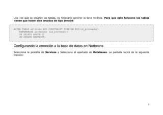 El documento describe los pasos para crear una aplicación web en Netbeans 6.1 utilizando bases de datos MySQL. Estos pasos incluyen crear las tablas en la base de datos, configurar la conexión a la base de datos en Netbeans, generar las entidades desde la base de datos, agregar librerías, crear la vista y vincularla con el modelo, y agregar un evento de registro para guardar datos en la base de datos.