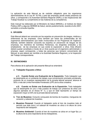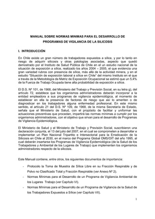 Este manual establece normas mínimas para programas de vigilancia de la silicosis en Chile. Explica que muchos trabajadores están expuestos a sílice y en riesgo de silicosis. Describe las responsabilidades legales de organismos administrativos y empresas para monitorear la salud de los trabajadores y los niveles ambientales de sílice. Además, provee definiciones, protocolos de muestreo y frecuencias recomendadas para las evaluaciones.