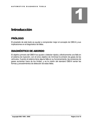 Este documento proporciona una introducción al estándar OBD-II para el diagnóstico de fallas en vehículos. Explica los diferentes modos de prueba de OBD-II, cómo se codifican los códigos de falla, y los requisitos para completar un ciclo de manejo para realizar pruebas de diagnóstico. También describe los sistemas de monitoreo continuo y no continuo y cómo el software puede usarse para acceder a información sobre códigos de falla, cuadros de datos y lecturas en vivo de la ECU.