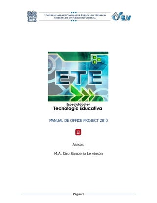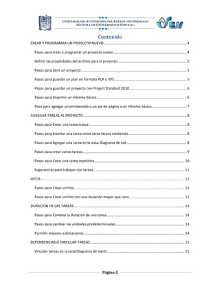 Este documento proporciona instrucciones para crear y programar un proyecto nuevo en Microsoft Project 2010, agregar tareas al proyecto, crear hitos, administrar la duración de las tareas, vincular tareas, organizar el esquema del proyecto, crear calendarios, y guardar y publicar proyectos. Instruye sobre cómo definir propiedades del archivo, abrir y guardar proyectos, e imprimir informes básicos. También explica cómo crear tareas nuevas, repetitivas y de resumen, e insertar tareas entre otras exist