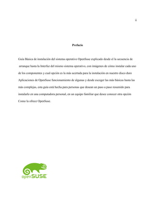 Este documento proporciona una guía paso a paso para instalar el sistema operativo OpenSUSE. Explica el proceso de arranque, selección del idioma, modo de instalación, personalización incluyendo zona horaria, tipo de escritorio y partición, creación de usuario y contraseña, y configuración e inicio del sistema. Finalmente, muestra brevemente la interfaz de OpenSUSE y cómo interactuar con el shell para crear directorios.