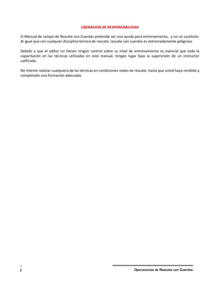 Este documento presenta información sobre operaciones de rescate con cuerdas, incluyendo liberación de responsabilidad, equipos de protección personal, nudos de rescate, anclajes, protección de bordes, empaque de pacientes, tipos de camillas, los tres componentes principales de un sistema de rescate con cuerdas y varias configuraciones de sistemas.