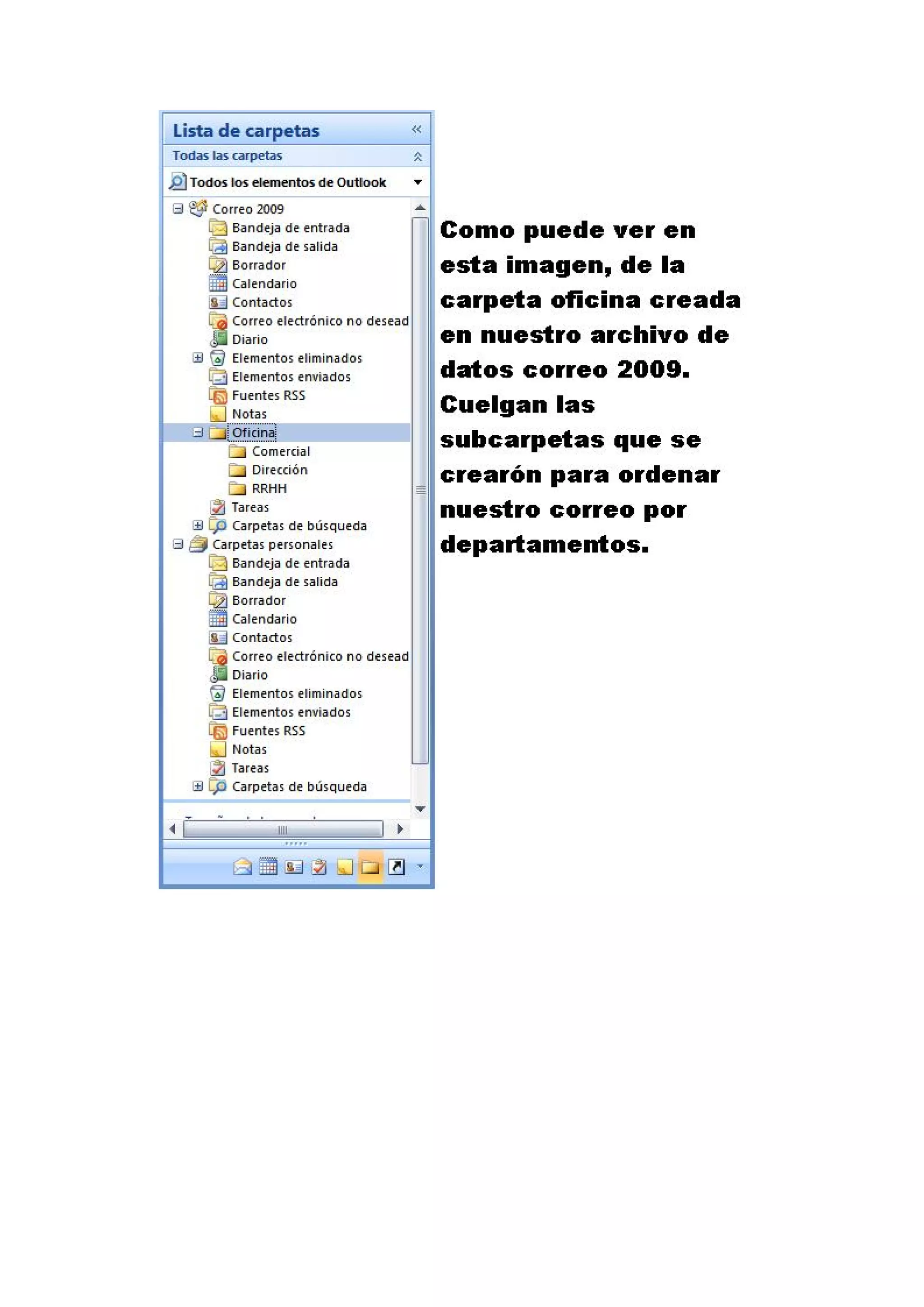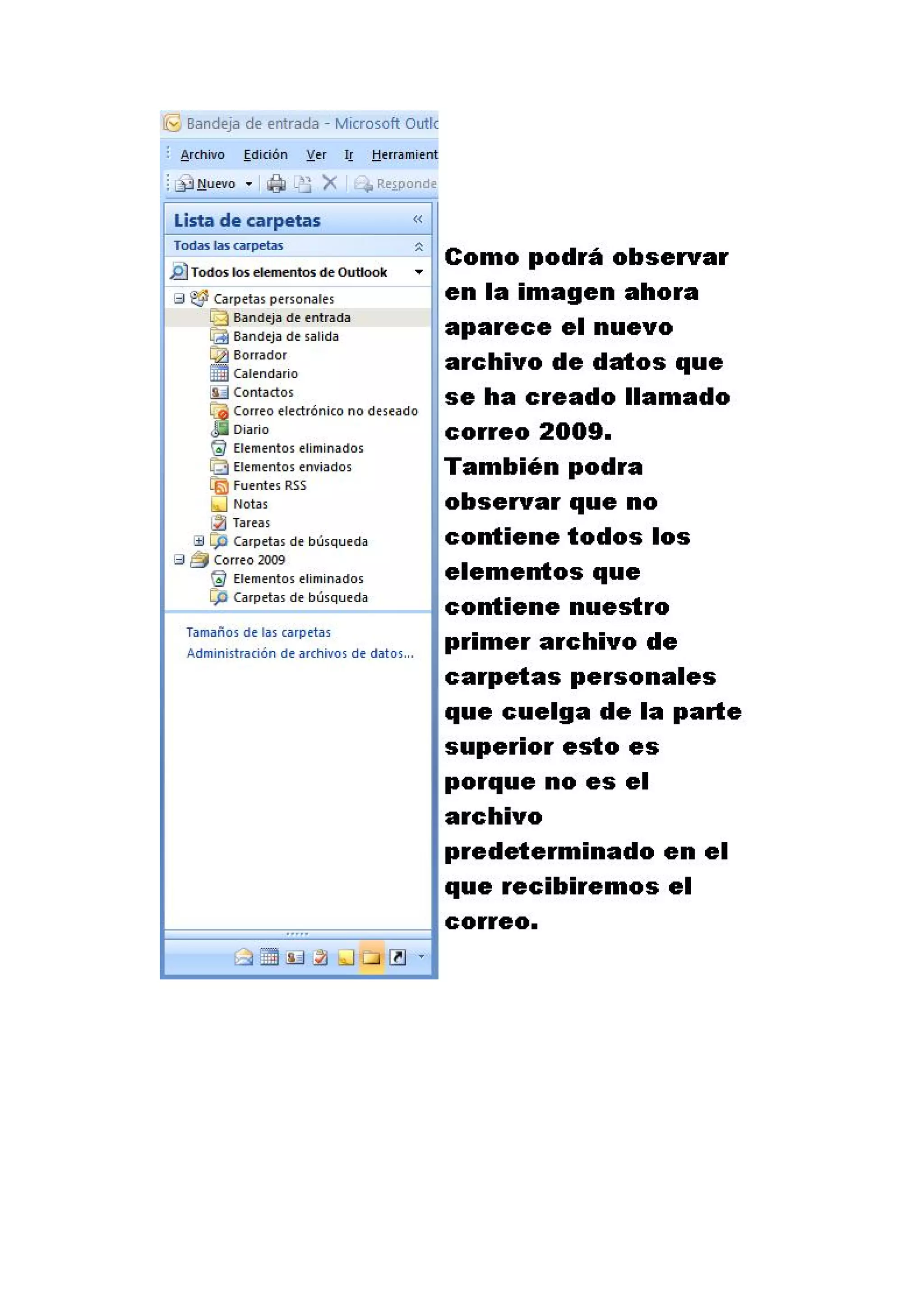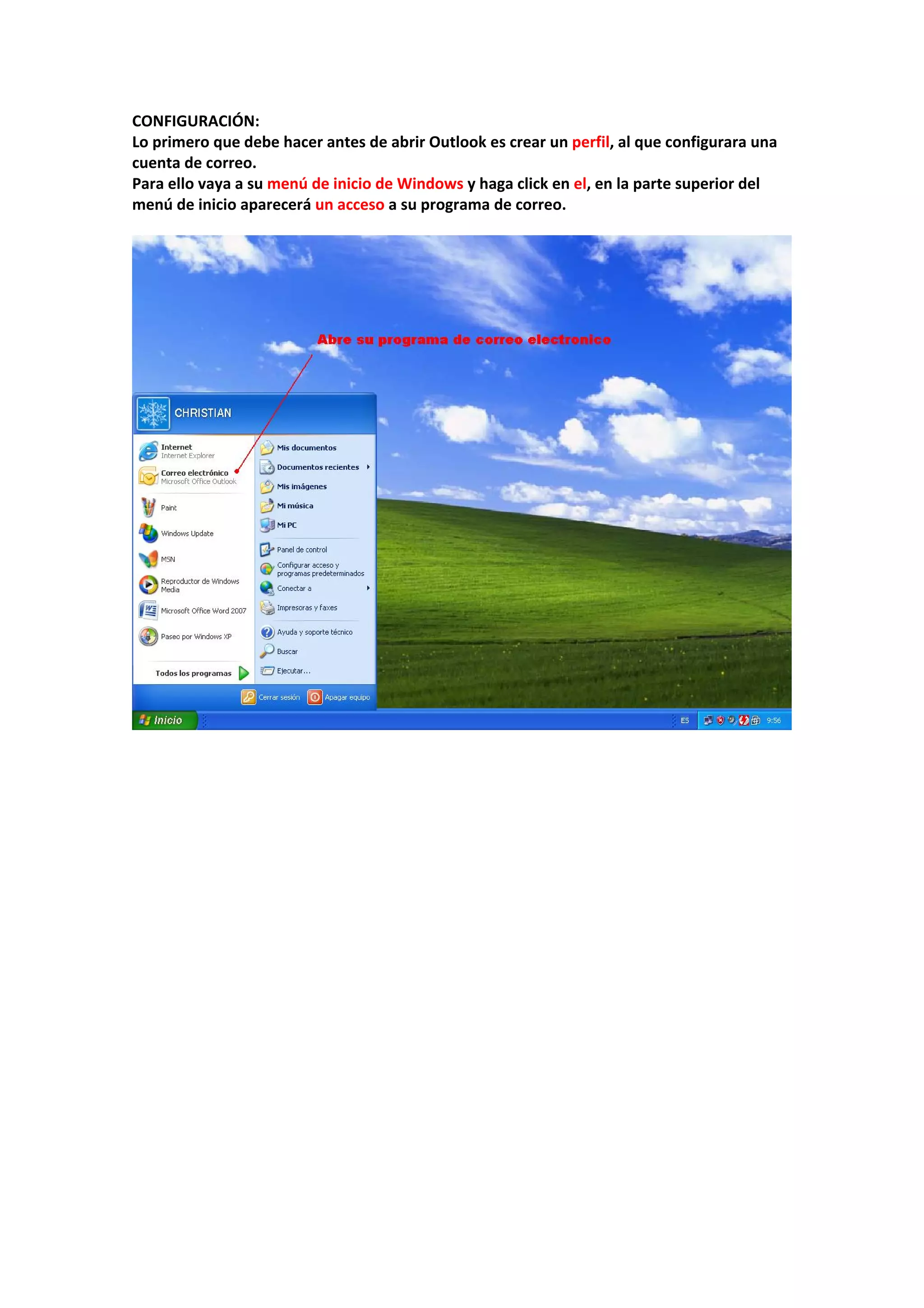 Este documento proporciona instrucciones para configurar Outlook 2007, crear contactos, citas y notas. Explica cómo crear un perfil de usuario y agregar una cuenta de correo electrónico, y cómo generar un archivo .pst para almacenar y compartir datos entre versiones de Outlook.