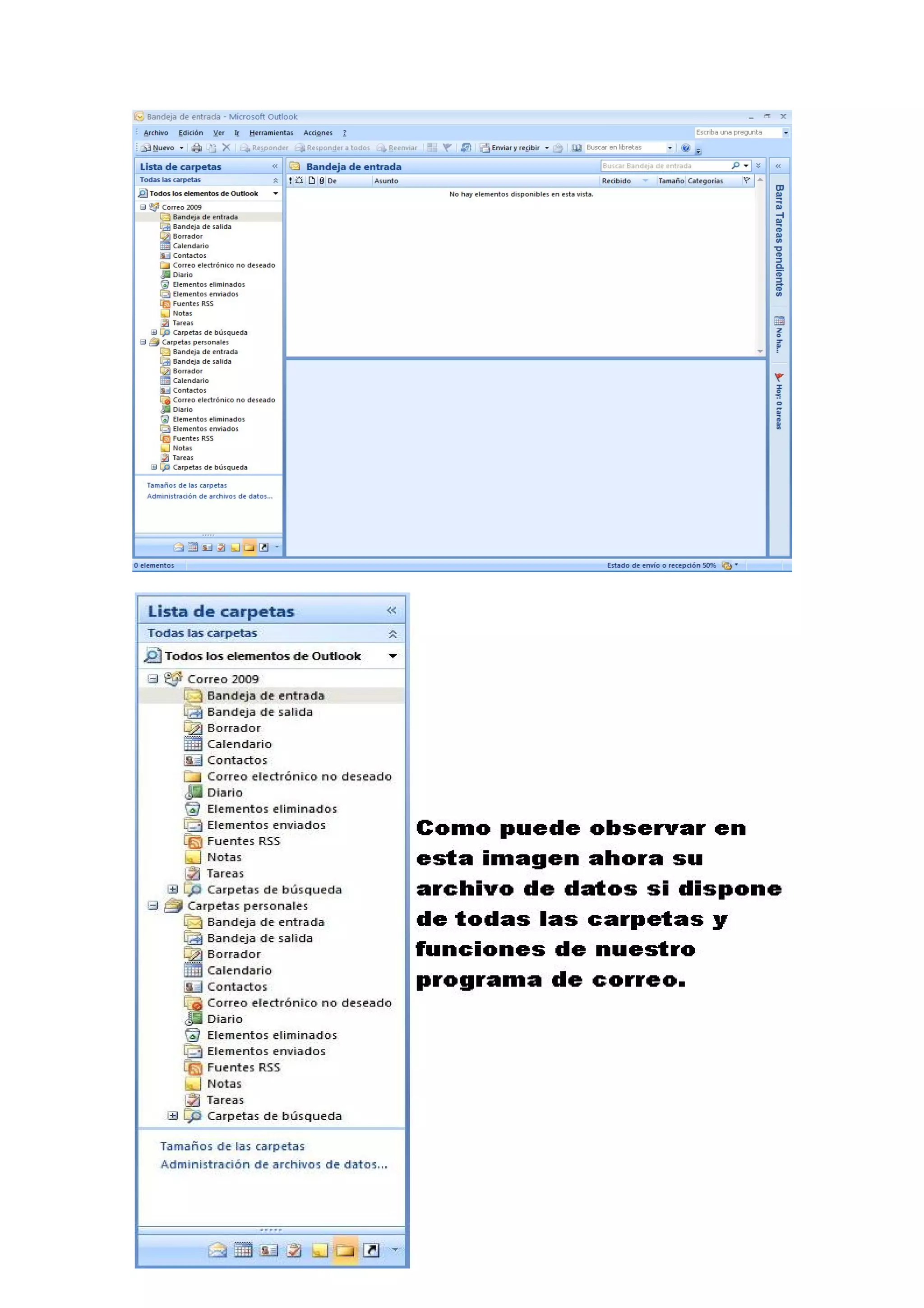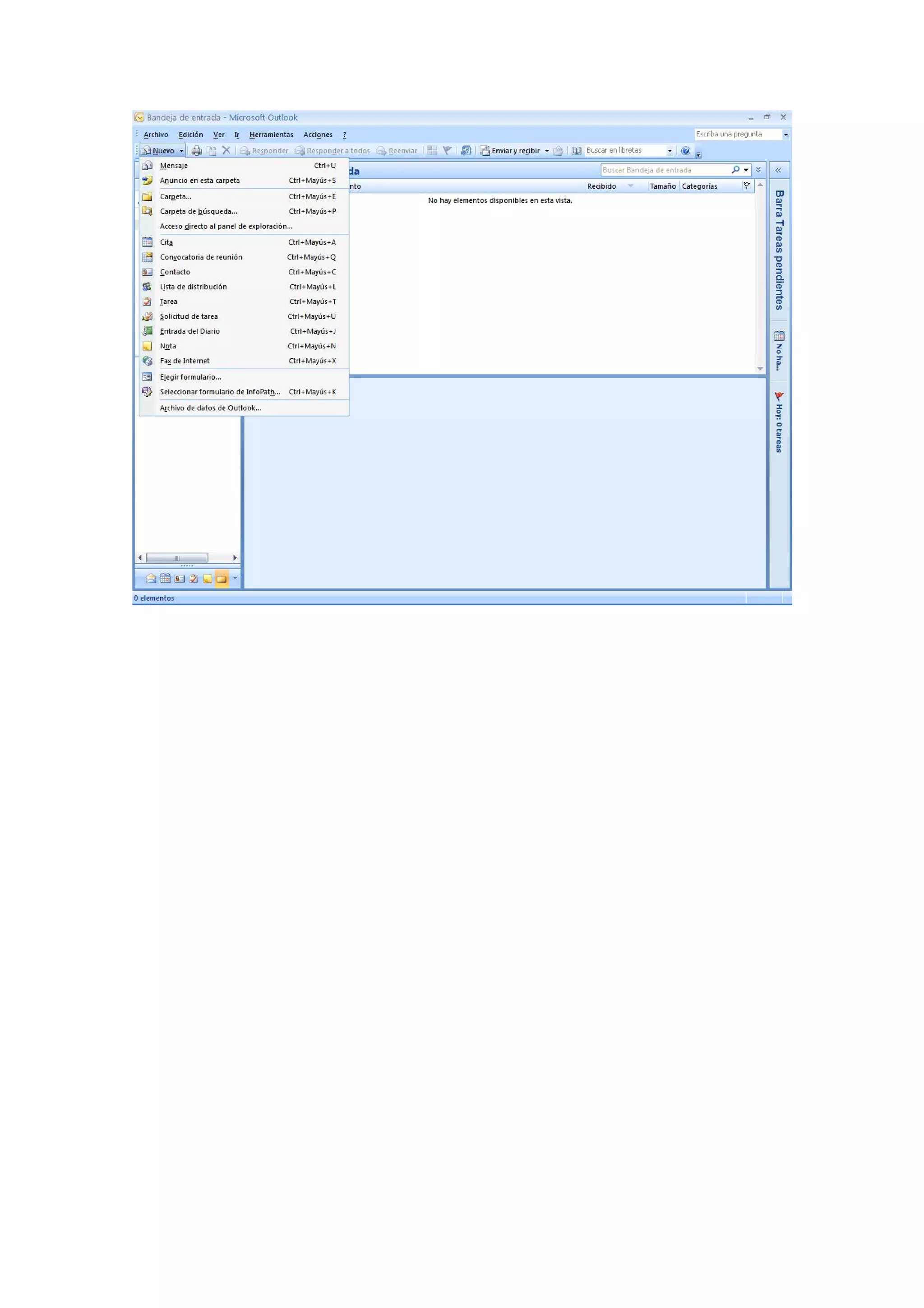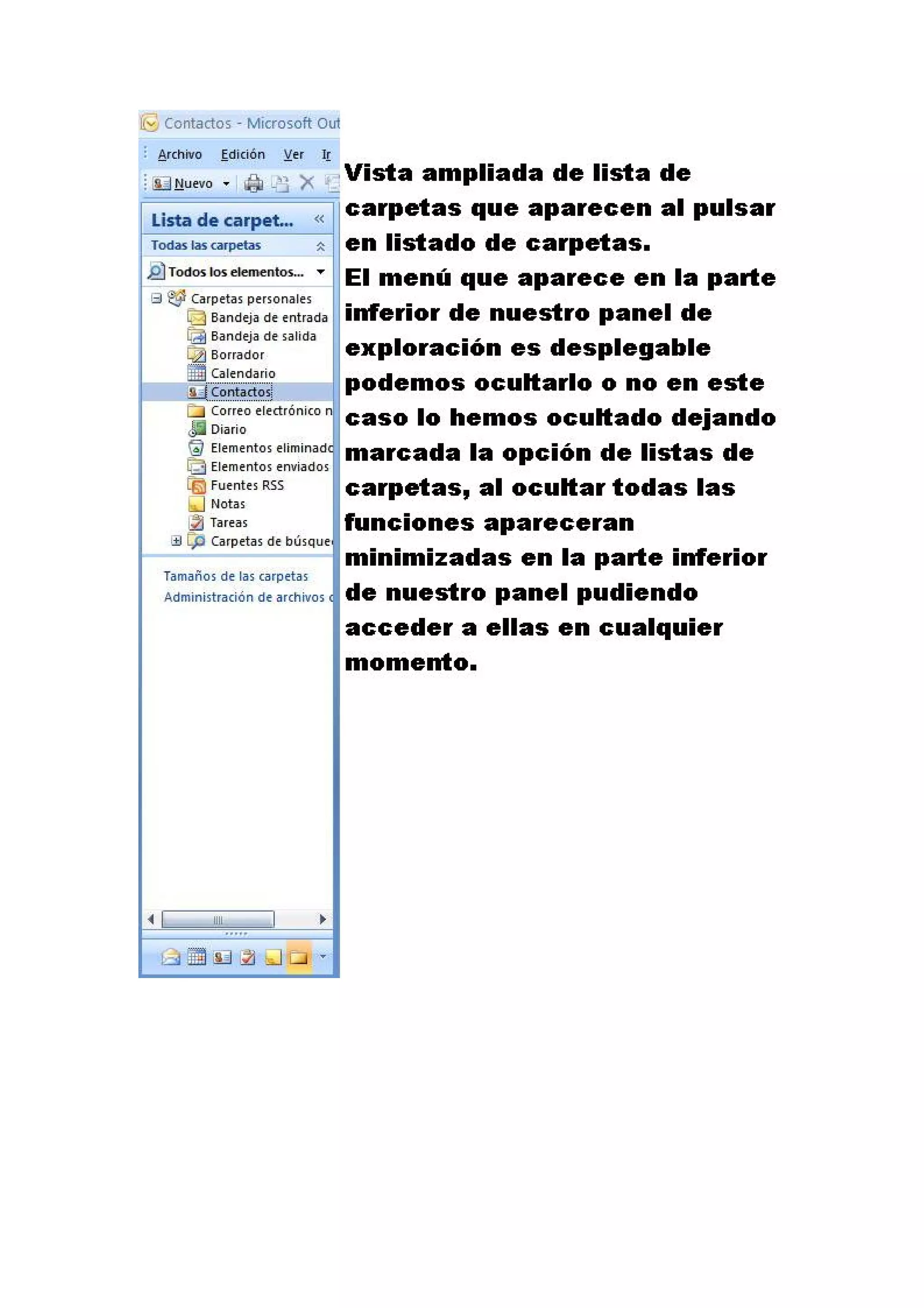 Este documento proporciona instrucciones para configurar Outlook 2007, crear contactos, citas y notas. Explica cómo crear un perfil de usuario y agregar una cuenta de correo electrónico, y cómo generar un archivo .pst para almacenar y compartir datos entre versiones de Outlook.