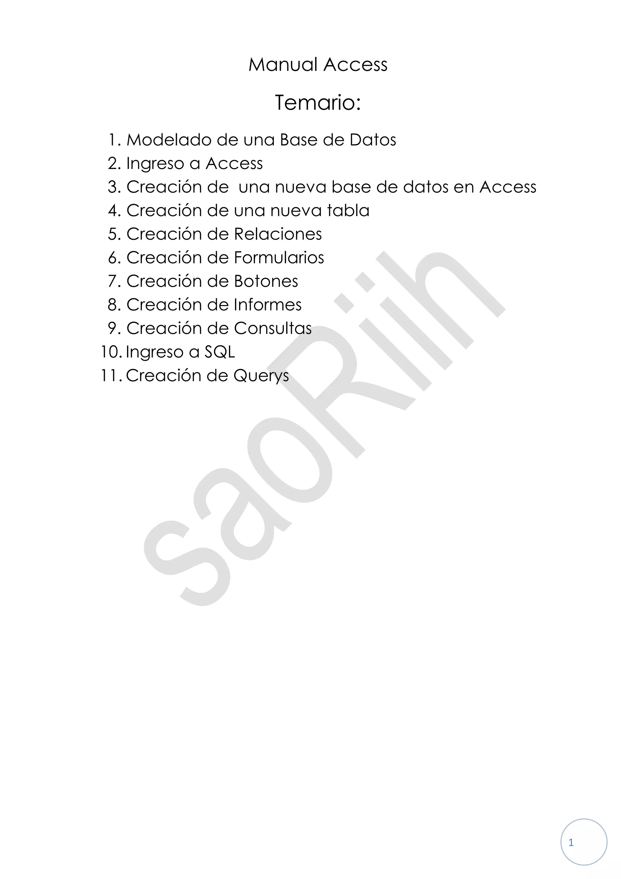Este documento proporciona instrucciones para crear y administrar una base de datos en Access. Explica cómo modelar los datos, crear tablas y formularios, establecer relaciones entre tablas, y generar informes y consultas. También cubre la creación de botones, el uso de SQL y diferentes tipos de queries para recuperar y manipular datos.