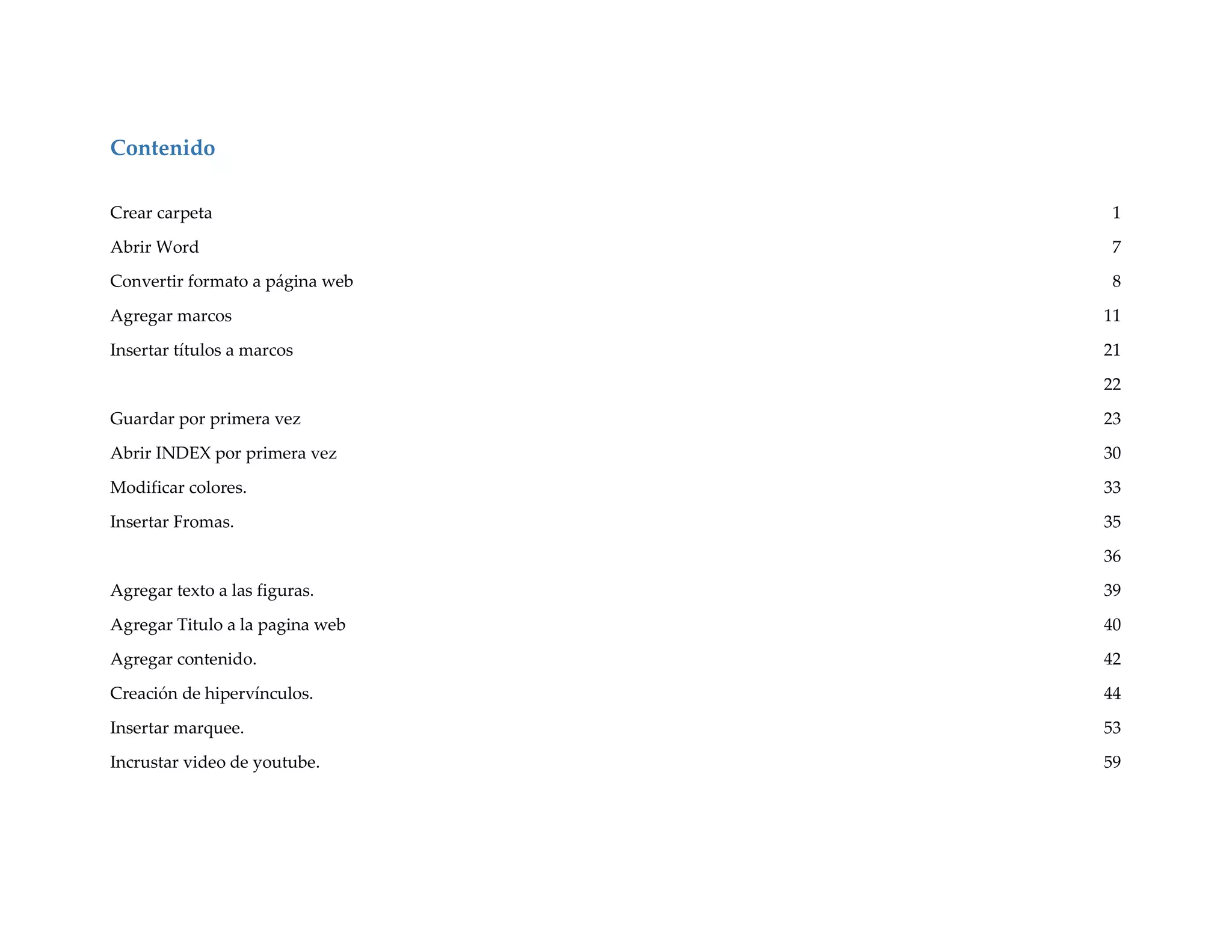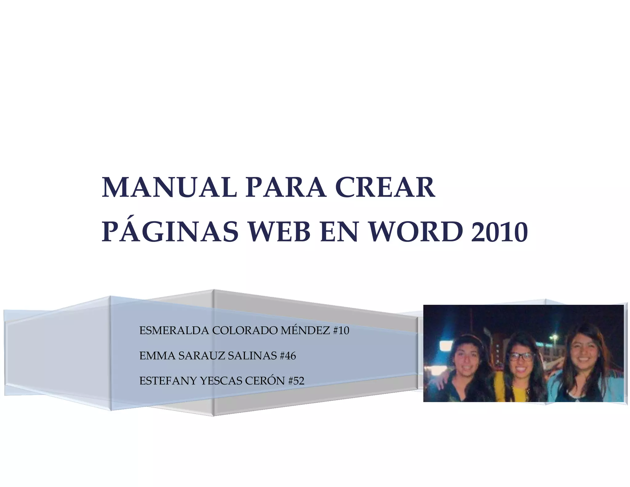 Este documento proporciona instrucciones paso a paso para crear una página web básica en Microsoft Word 2010, incluyendo cómo agregar marcos, modificar colores, insertar formas, agregar texto e imágenes, crear hipervínculos, agregar una marquesina y videos de YouTube. El proceso implica crear una carpeta para almacenar los archivos de la página web, convertir el formato a página web en Word, agregar y personalizar marcos, guardar e indexar los archivos, y agregar contenido como texto, imágenes e hip