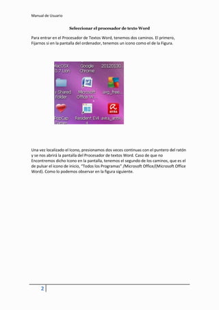 Este manual describe las funciones y herramientas del programa Microsoft Word. Explica cómo crear documentos, aplicar formato de texto, insertar tablas, imágenes y otros objetos, diseñar páginas, agregar referencias y realizar tareas de correspondencia. El manual proporciona instrucciones detalladas sobre cada una de las herramientas de Word.