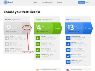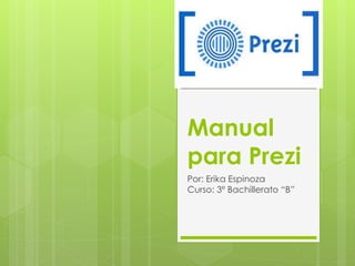 Este documento proporciona instrucciones sobre cómo crear una cuenta en Prezi y una presentación nueva. Explica que para crear una cuenta, el usuario debe ingresar a la página web de Prezi, seleccionar una licencia y completar el registro con nombre, correo y contraseña. Una vez creada la cuenta, el usuario puede crear una nueva presentación y elegir un tema. También describe cómo insertar texto y cómo organizar la ruta de presentación mediante la sección "Editar Ruta".