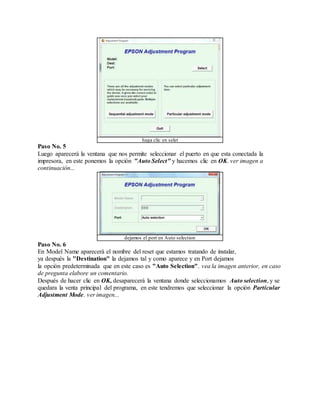 El documento proporciona instrucciones en 8 pasos para descargar, descomprimir e instalar un programa de reseteo de impresora. Primero se debe descargar el archivo comprimido y descomprimirlo usando un programa como WinRAR. Luego, se ejecuta el archivo del programa y se selecciona el puerto de la impresora y la opción "Waste Ink Pad Counter". Finalmente, se verifican las opciones y se reinicia la impresora para reanudar el contador de páginas.