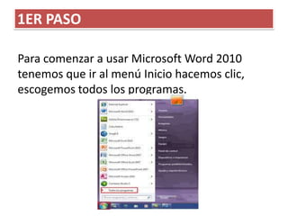 Este documento proporciona un manual paso a paso para usar Microsoft Word 2010. Explica los cuatro pasos principales: 1) Abrir el programa desde el menú Inicio o creando un acceso directo en el escritorio, 2) Analizar las partes de la ventana del programa como la barra de título, botones y cintas de opciones, 3) Ubicar la barra de estado en la parte inferior para ver información sobre la página y palabras, y 4) Estar listo para trabajar visualizando el documento en la parte central.