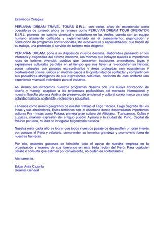 El documento presenta información sobre Peruvian Dream Tour Operator E.I.R.L., una empresa peruana de turismo con experiencia en ecoturismo y turismo vivencial en los Andes peruanos. La empresa ofrece nuevos destinos y programas turísticos que incluyen rutas de turismo vivencial, pueblos con tradiciones culturales, zonas naturales y áreas protegidas. Además, proporciona detalles sobre varias excursiones como Sillustani, Islas Flotantes de los Uros, Isla Taquile, Isla Amant