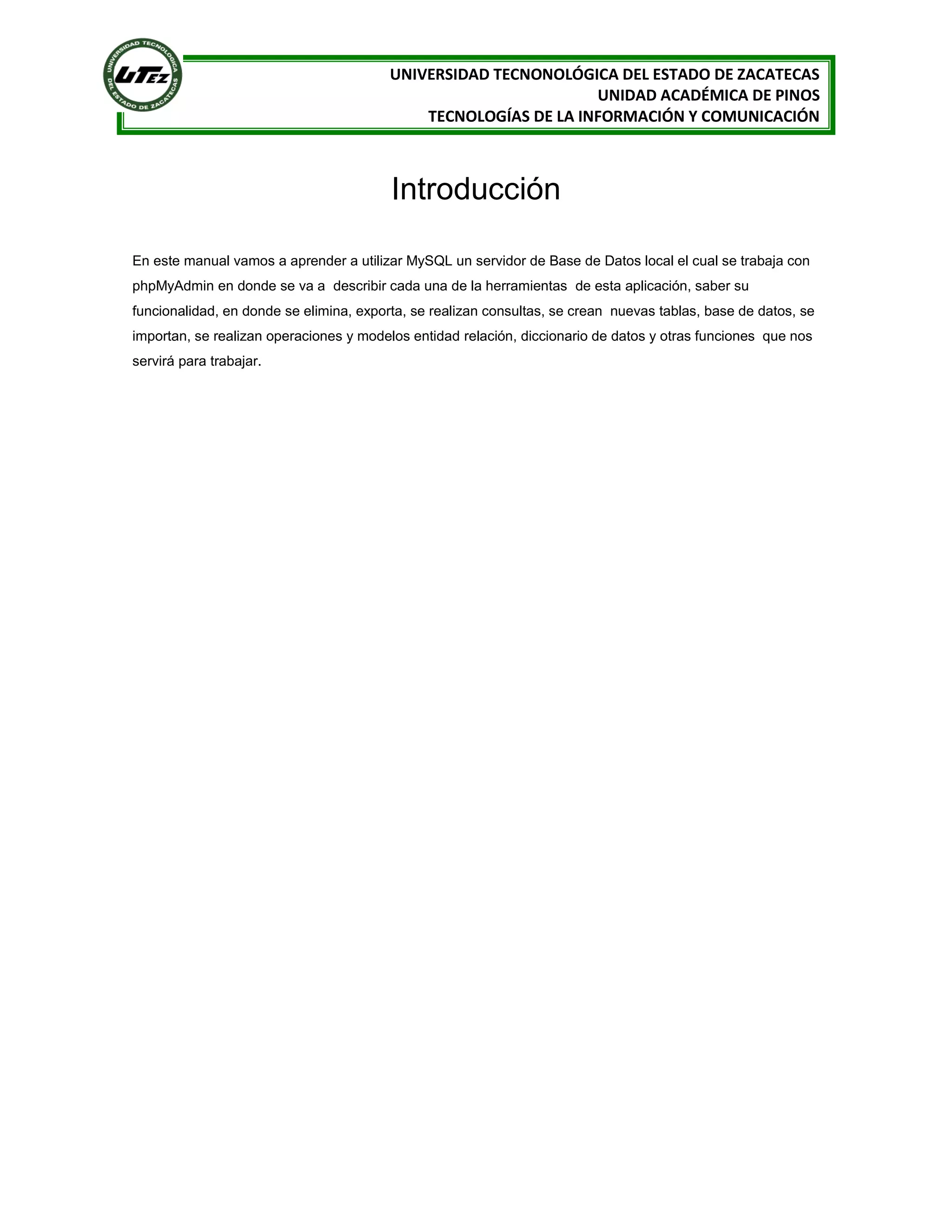 Este documento proporciona instrucciones para instalar XAMPP y MySQL y crear una base de datos utilizando phpMyAdmin. Explica cómo instalar XAMPP, ejecutar MySQL y Apache, y acceder a phpMyAdmin a través de un URL local. Luego describe las herramientas en phpMyAdmin para crear tablas, realizar consultas SQL, buscar datos, exportar e importar bases de datos, y diseñar modelos entidad-relación.