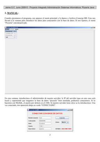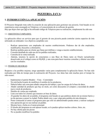 El documento describe un proyecto de software para gestionar una pizzería, desarrollado por Jaime G.C. en junio de 2009, que permite al gerente controlar empleados, realizar pedidos y consultar ventas. También menciona posibles mejoras para futuras versiones, como implementar un sistema de categorías y la posibilidad de modificar pedidos. Además, se detalla el funcionamiento de la aplicación, incluyendo la conexión a bases de datos y el manejo de datos de clientes y pedidos.
