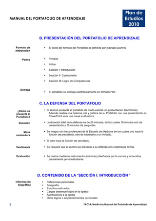 Este documento presenta las directrices para la elaboración del portafolio de aprendizaje que los estudiantes de medicina deben presentar a lo largo de su carrera. Explica que el portafolio tiene el objetivo de que los estudiantes asuman responsabilidad sobre su aprendizaje y presenten evidencias y reflexiones sobre este. Además, detalla los contenidos y la estructura que debe seguir el portafolio, así como el proceso de elaboración y defensa del mismo ante un comité evaluador.