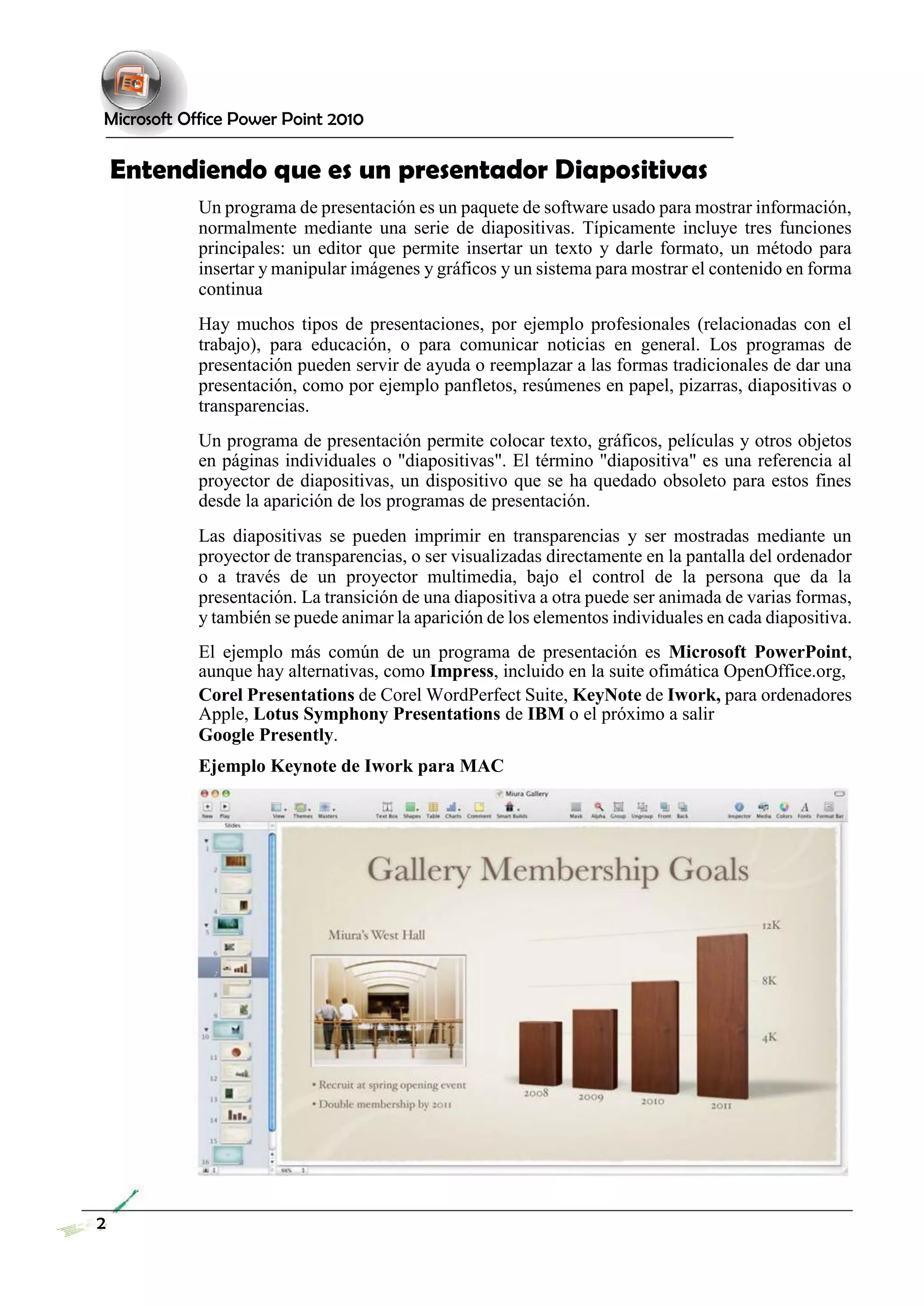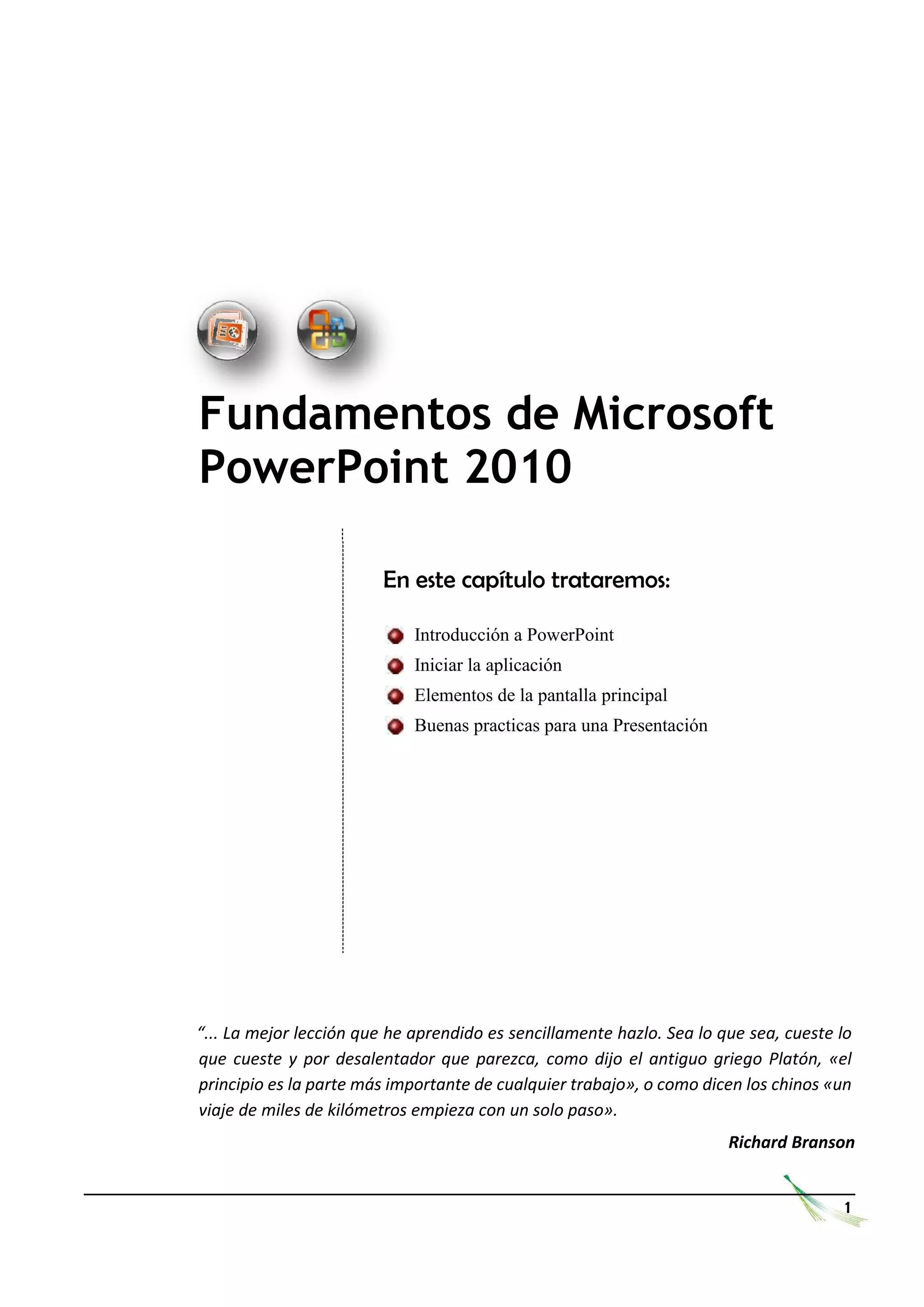 Este documento ofrece una introducción a Microsoft PowerPoint 2010, incluyendo cómo iniciar la aplicación, los elementos de la pantalla principal y las mejores prácticas para crear presentaciones. Explica que PowerPoint permite insertar texto, imágenes, gráficos y otros objetos en diapositivas individuales para crear presentaciones. Además, proporciona consejos sobre diseñar diapositivas de manera simple, visual y clara, usando colores vibrantes y manteniendo la información concisa.