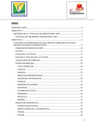 Este documento presenta un curso de PowerPoint para cooperativistas. Explica cómo identificar la ventana de PowerPoint y utilizar las herramientas del programa para crear presentaciones efectivas. Detalla cómo seleccionar formatos, fuentes, colores y efectos para las diapositivas, e insertar objetos como tablas, imágenes y formas. Además, cubre cómo utilizar transiciones, animaciones y diseños, y revisar la ortografía y gramática de la presentación. El objetivo es enseñar a los cooperativistas a realizar exposiciones