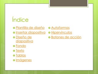 Este documento proporciona un mini tutorial sobre PowerPoint. Explica cómo insertar y diseñar diapositivas, agregar texto, tablas, imágenes, hipervínculos, botones de acción y elementos multimedia como sonidos y videos. También cubre cómo configurar la presentación con transiciones, animaciones, ocultar diapositivas y establecer tiempos. Finalmente, explica cómo guardar la presentación en diferentes formatos como PPT, video y PDF.