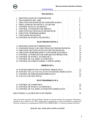 Este manual presenta 25 prácticas sobre neumática, electroneumática e hidráulica para la asignatura correspondiente impartida en la Universidad Tecnológica del Estado de Zacatecas. Las prácticas cubren temas como identificación de componentes, circuitos básicos, simulación, control de prensas, circuitos secuenciales, temporizadores, contadores y control de puertas y equipos neumáticos y hidráulicos. Cada práctica describe el objetivo, equipo requerido, procedimiento y referencias.