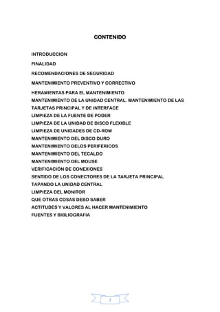 Este documento presenta un manual de mantenimiento preventivo y correctivo para computadores. Explica los procedimientos para realizar el mantenimiento de cada componente del sistema, incluyendo la unidad central, tarjetas, fuente de poder, unidades de disco y periféricos. También recomienda herramientas para el mantenimiento y precauciones de seguridad al manipular los equipos.