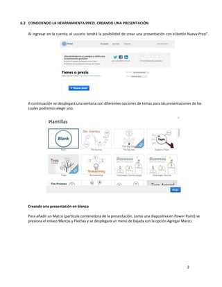 El documento describe las funciones y herramientas de la plataforma Prezi para crear presentaciones digitales interactivas. Prezi permite insertar texto, imágenes, videos, diagramas y diseños predefinidos. Los usuarios pueden crear, editar, descargar y compartir presentaciones de manera colaborativa en línea o fuera de línea.