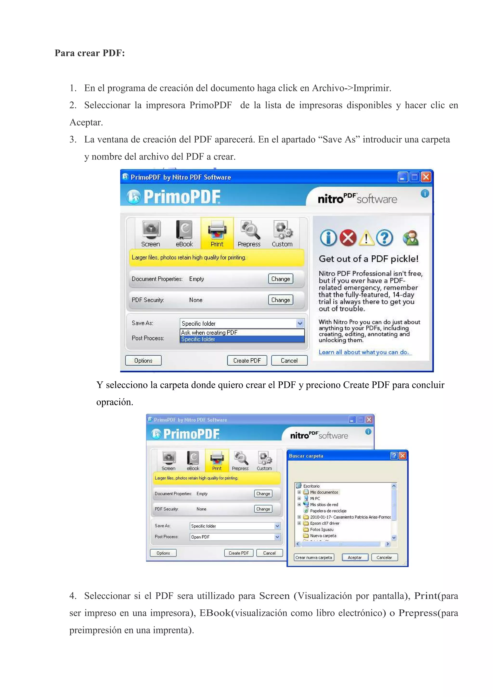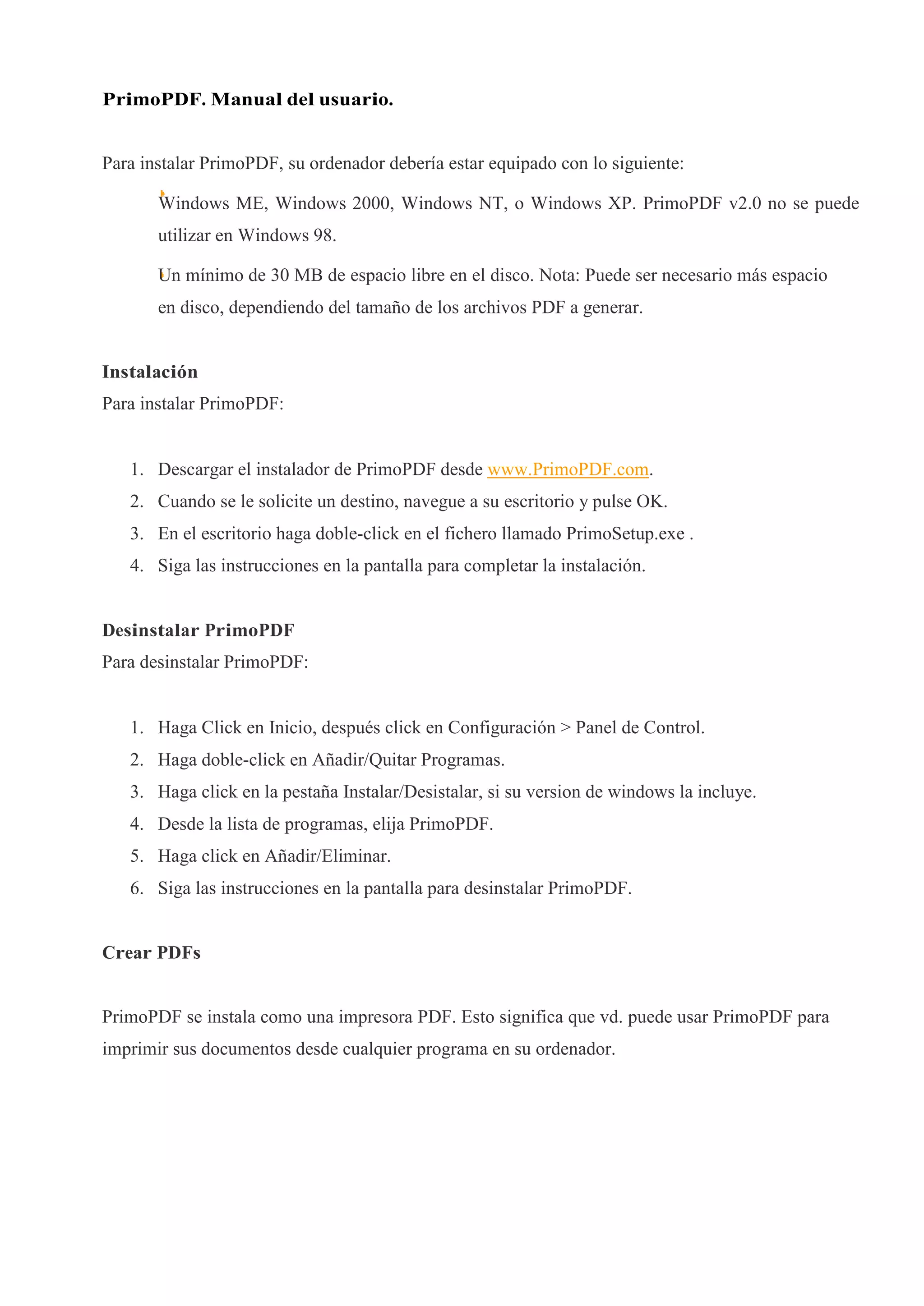 Este manual describe cómo instalar y utilizar el software PrimoPDF. Explica los requisitos del sistema, el proceso de instalación, cómo crear PDFs imprimiendo desde otros programas a PrimoPDF como una impresora virtual, y cómo configurar opciones como la seguridad y propiedades de los documentos PDF creados.