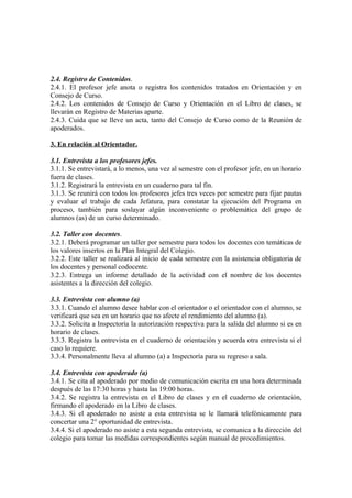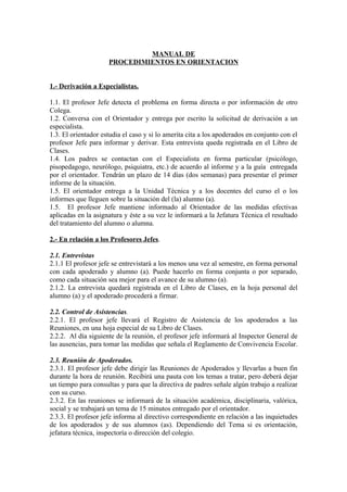 Este documento presenta los procedimientos de orientación en una escuela. Detalla los roles y responsabilidades del orientador, los profesores jefes, y los especialistas. Incluye procedimientos para derivaciones a especialistas, entrevistas con estudiantes, apoderados y profesores, visitas de clase, y reuniones de apoderados. El objetivo general es proveer apoyo a estudiantes y coordinar esfuerzos entre el personal de la escuela.