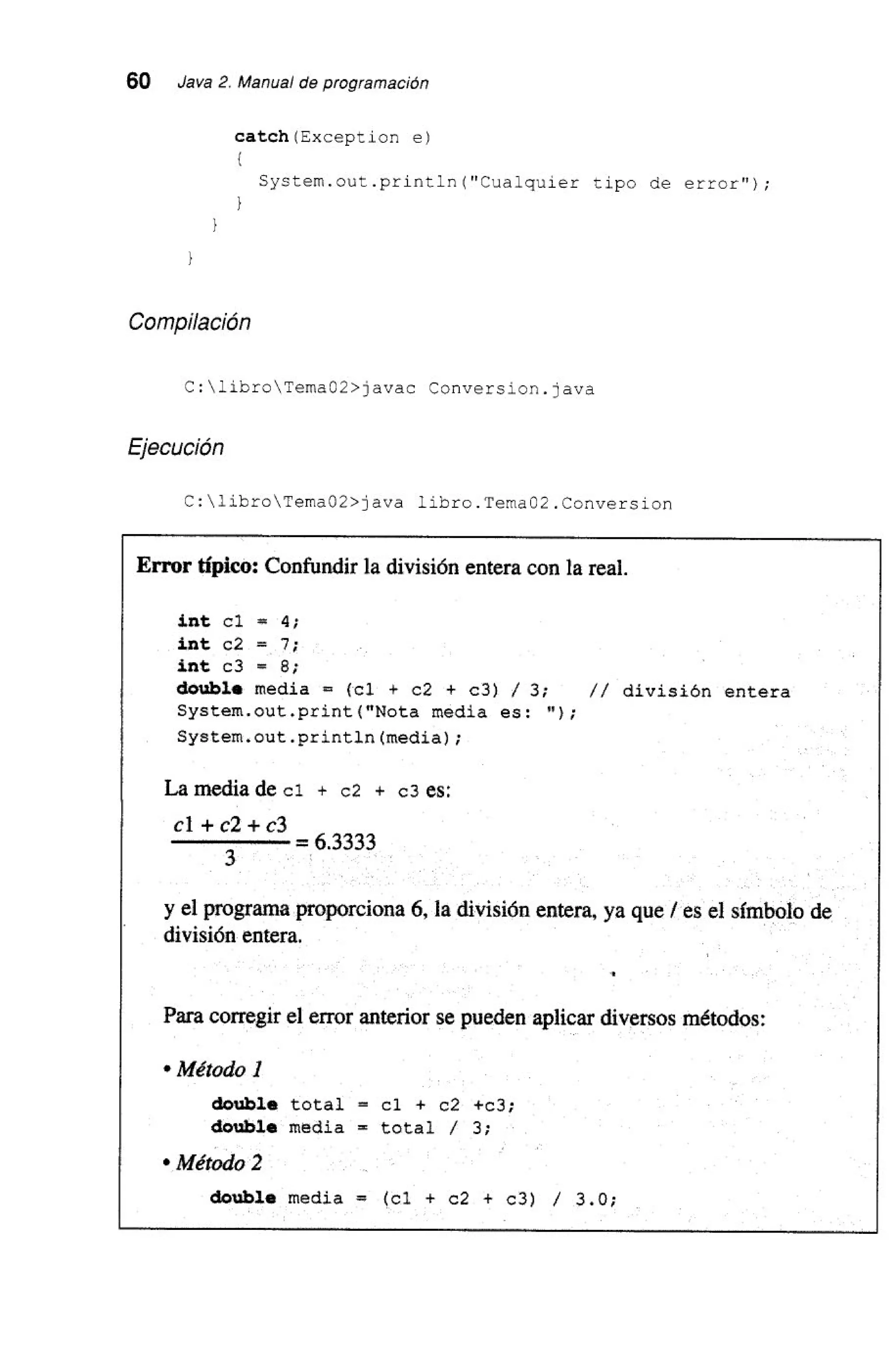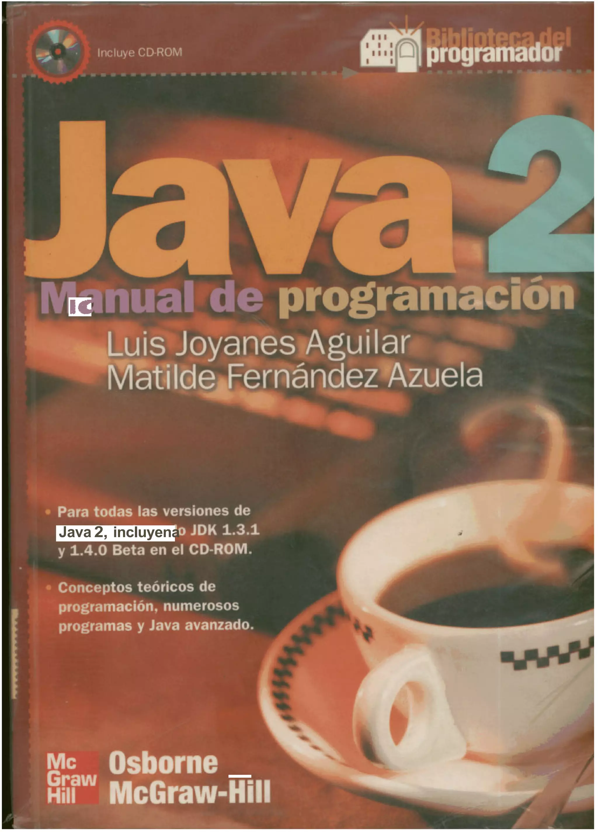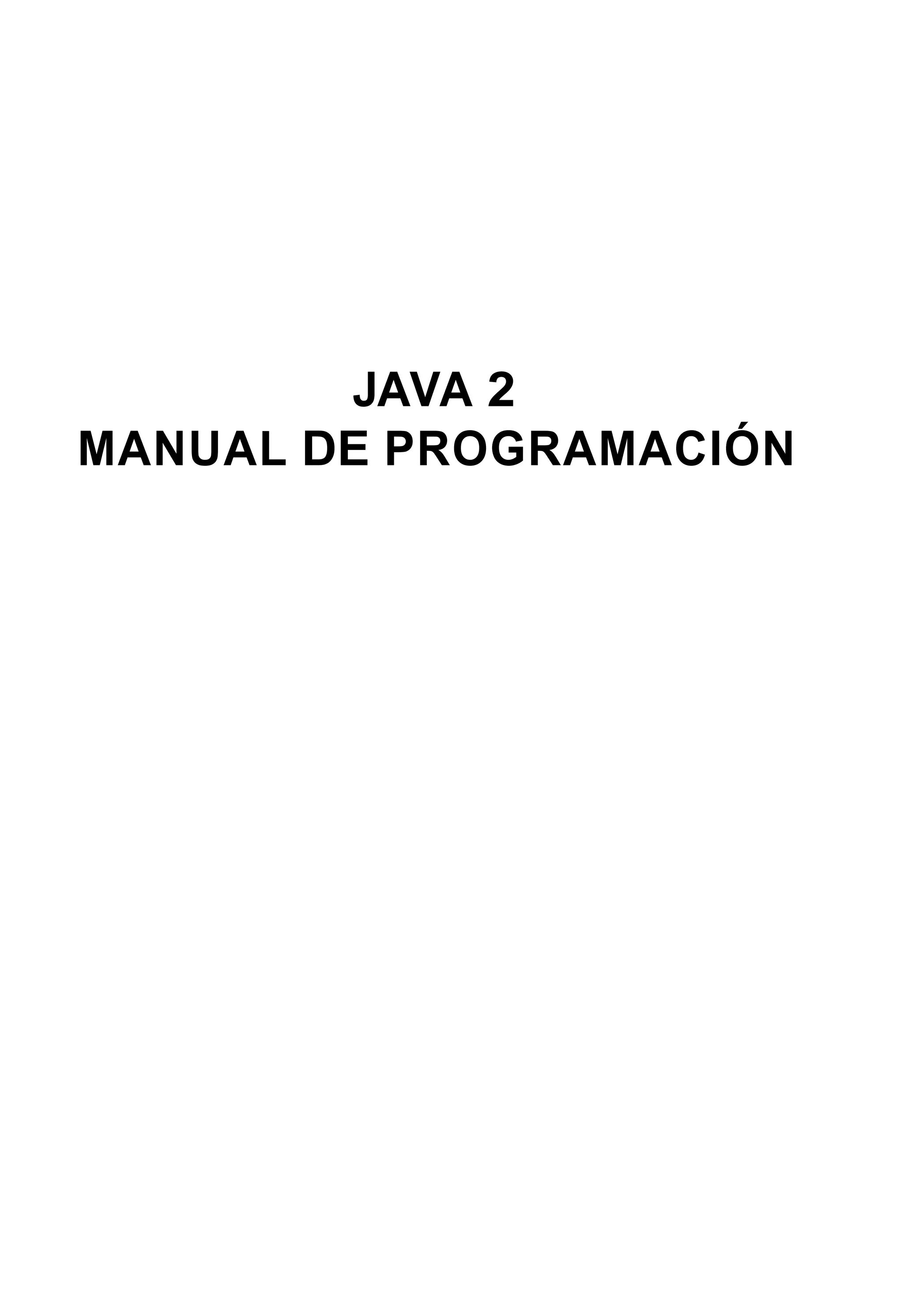 Este documento presenta el manual de programación de Java 2. Contiene 15 capítulos que cubren las características básicas del lenguaje Java, incluyendo clases, objetos, herencia, encapsulamiento, polimorfismo, arrays, cadenas, interfaces gráficas de usuario, applets, hilos, excepciones y archivos. El manual proporciona ejemplos de código para ilustrar los conceptos y técnicas de programación en Java.