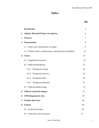Este manual explica cómo usar Microsoft Project 2003 para la gestión de proyectos de construcción. Explica cómo configurar las opciones de Project, crear un nuevo proyecto, programar tareas, asignar recursos y costos, y crear tablas para hacer un seguimiento del presupuesto y el progreso del proyecto. El manual también cubre la creación de diagramas de red, la fijación de líneas base y el control de tiempos y costos.