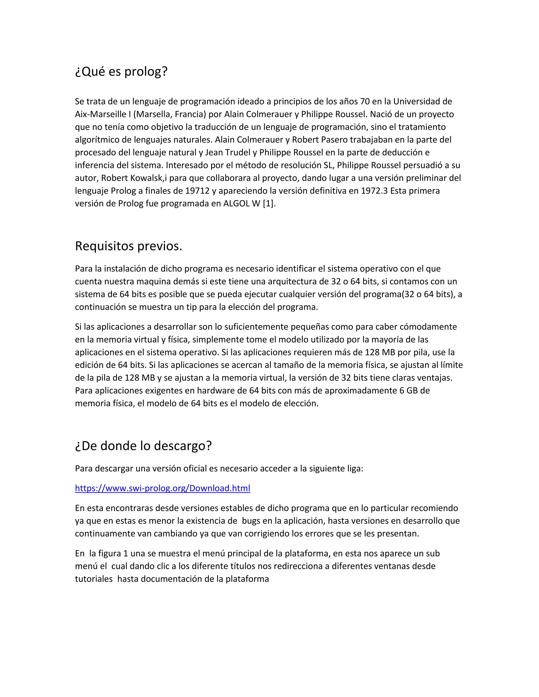Este documento proporciona instrucciones para instalar Prolog. Explica qué es Prolog, los requisitos previos para la instalación como el sistema operativo y la arquitectura, y cómo descargar e instalar el programa desde el sitio web oficial. Incluye imágenes guía del proceso de instalación paso a paso.