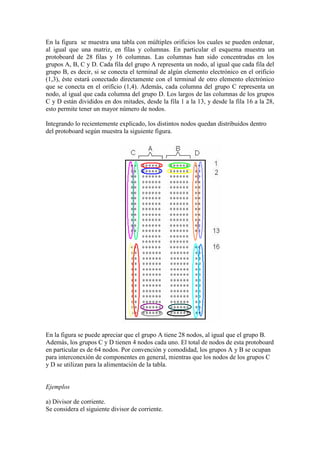 El documento describe un protoboard, una tabla que permite interconectar componentes electrónicos sin necesidad de soldarlos. Explica que los orificios del protoboard están conectados entre sí en grupos de filas y columnas, creando nodos que permiten conectar fácilmente circuitos eléctricos. Muestra imágenes de un protoboard con 28 filas y 16 columnas, dividiendo los nodos en 4 grupos y dando ejemplos de cómo conectar divisores de corriente y voltaje en un protoboard.