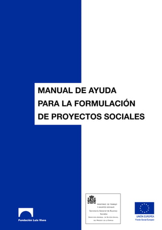 Este manual proporciona información sobre la formulación de proyectos sociales, especialmente para proyectos de inserción laboral de personas en riesgo de exclusión social. Explica los conceptos clave como proyecto, ciclo del proyecto y formulación. Además, describe los pasos para formular un proyecto exitoso, incluidos los objetivos, actividades y presupuesto. Finalmente, analiza los errores comunes y proporciona consejos para mejorar las solicitudes de financiamiento.