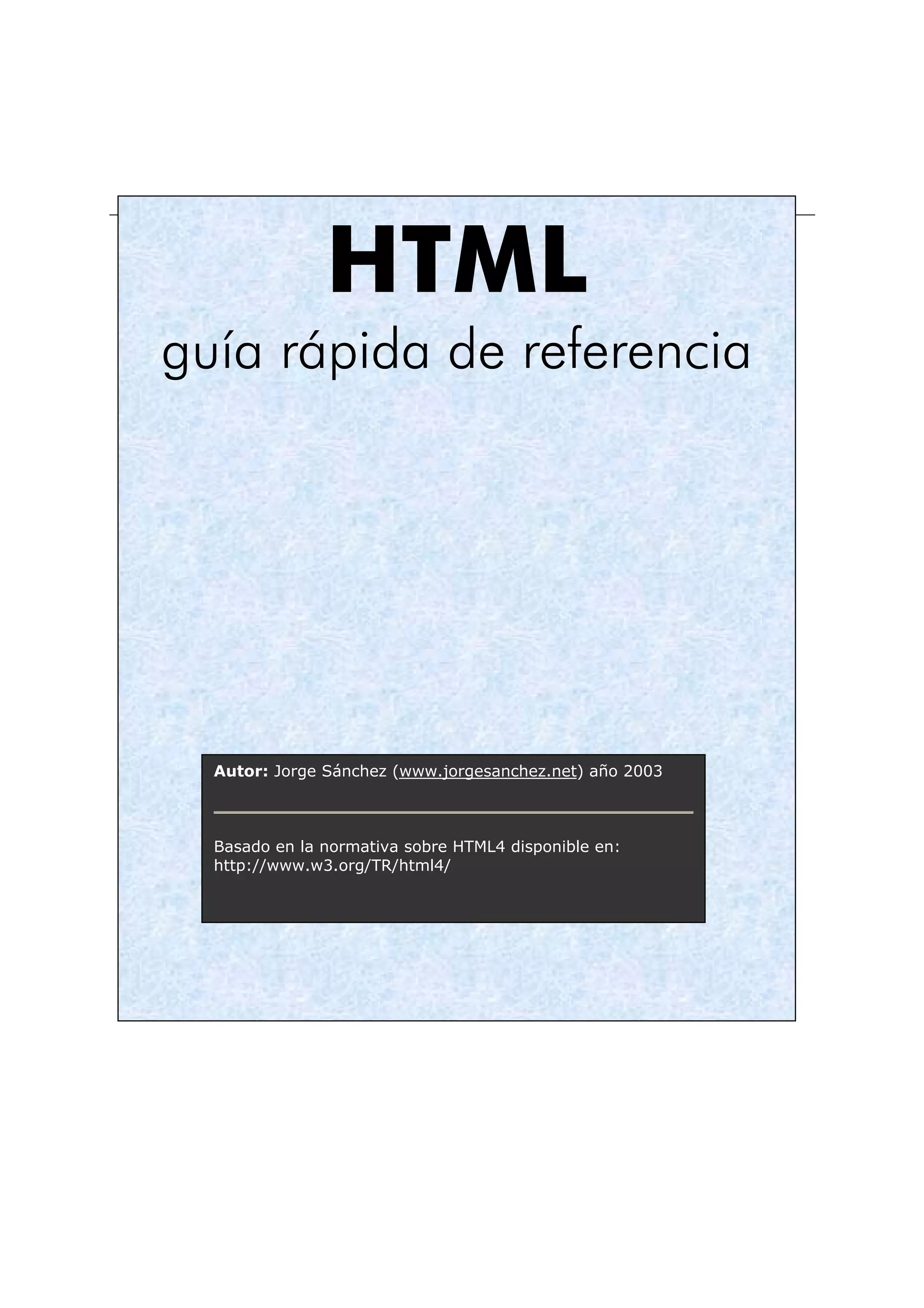 Este documento proporciona una guía rápida de referencia de HTML con una introducción a la estructura básica de los documentos HTML, una explicación de las etiquetas, atributos, comentarios y símbolos especiales más comunes de HTML, y una lista y descripción de las etiquetas de edición de texto, formato de caracteres, párrafos, listas, enlaces, imágenes, tablas, marcos y cabeceras. El autor es Jorge Sánchez y la guía está basada en la normativa HTML4 de W3C.