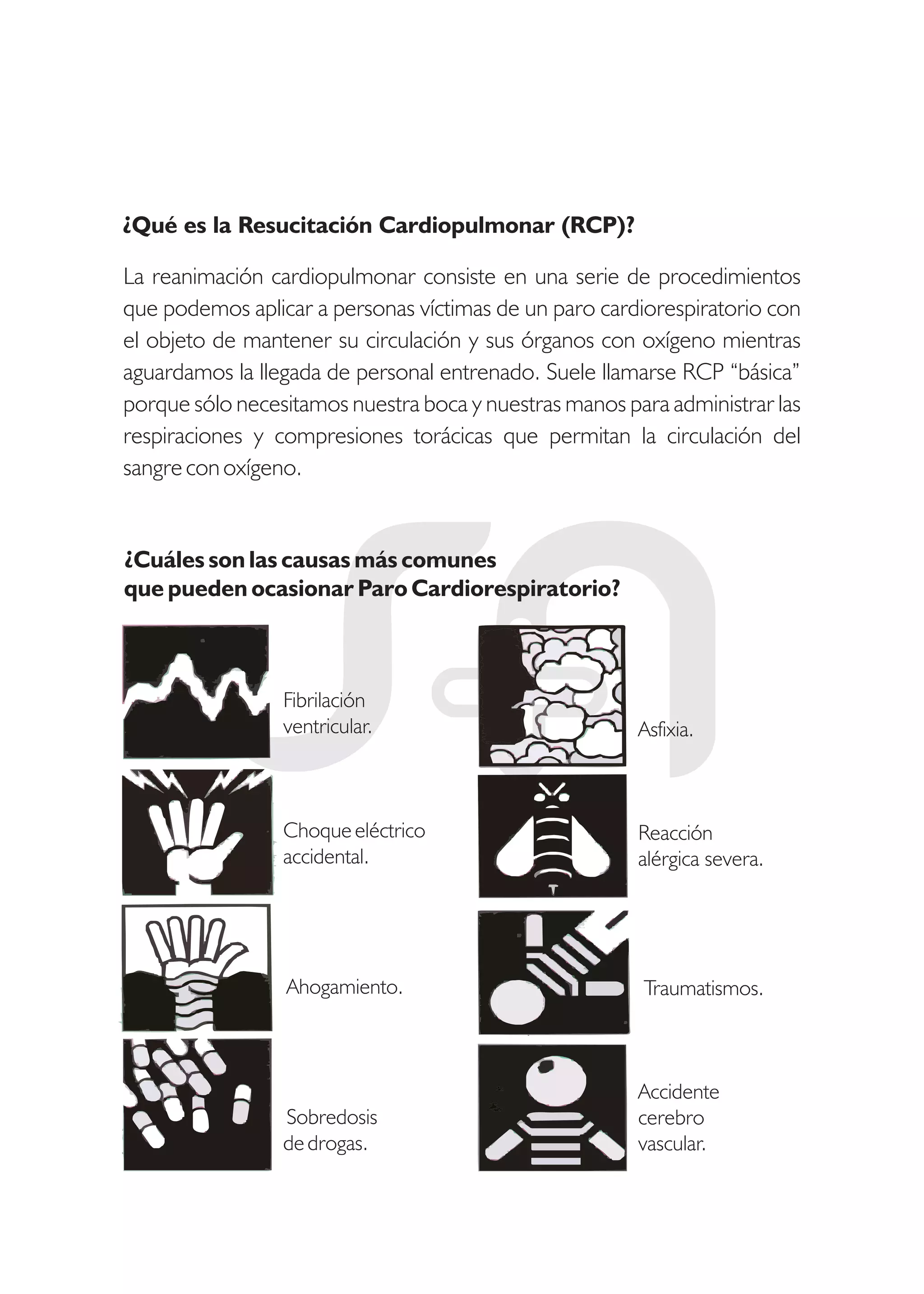El documento proporciona información sobre reanimación cardiopulmonar (RCP) básica. Explica que la RCP consiste en aplicar compresiones torácicas y ventilaciones para mantener la circulación y oxigenación mientras se espera ayuda médica. Detalla los pasos del procedimiento C-A-B (compresiones, apertura de vías aéreas, ventilación), incluyendo frecuencia y profundidad de compresiones. También cubre RCP en niños y el uso de la maniobra de Heimlich para obstrucciones de v
