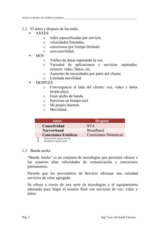Este documento proporciona una introducción a las redes de computadoras. Explica que una red es una colección de computadoras interconectadas que pueden compartir información y recursos. Describe los componentes clave de una red como nodos, medios de comunicación y protocolos. Además, clasifica los diferentes tipos de redes según su alcance y tamaño, como WPANs, LANs, MANs y WANs.