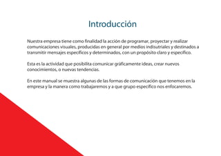 El documento presenta la línea gráfica y estrategia de comunicación de la empresa INNOVA. Describe sus objetivos de maximizar el engagement en redes sociales, establecer una identidad visual consistente, y enfocarse en clientes de 19 a 60 años de nivel socioeconómico alto y medio alto. También detalla los servicios que ofrece como diseño, fotografía, y producción de contenido para redes sociales, así como los elementos clave de su identidad visual como logotipo, tipografías, colores, y uso de elementos gráficos normalizados.