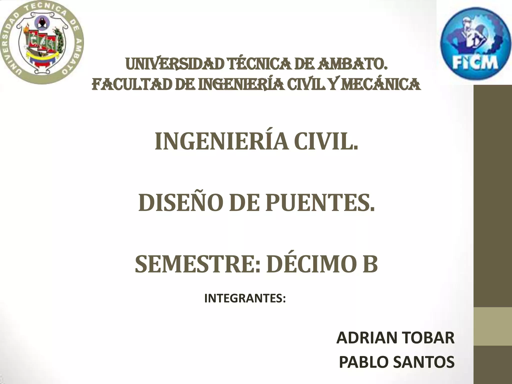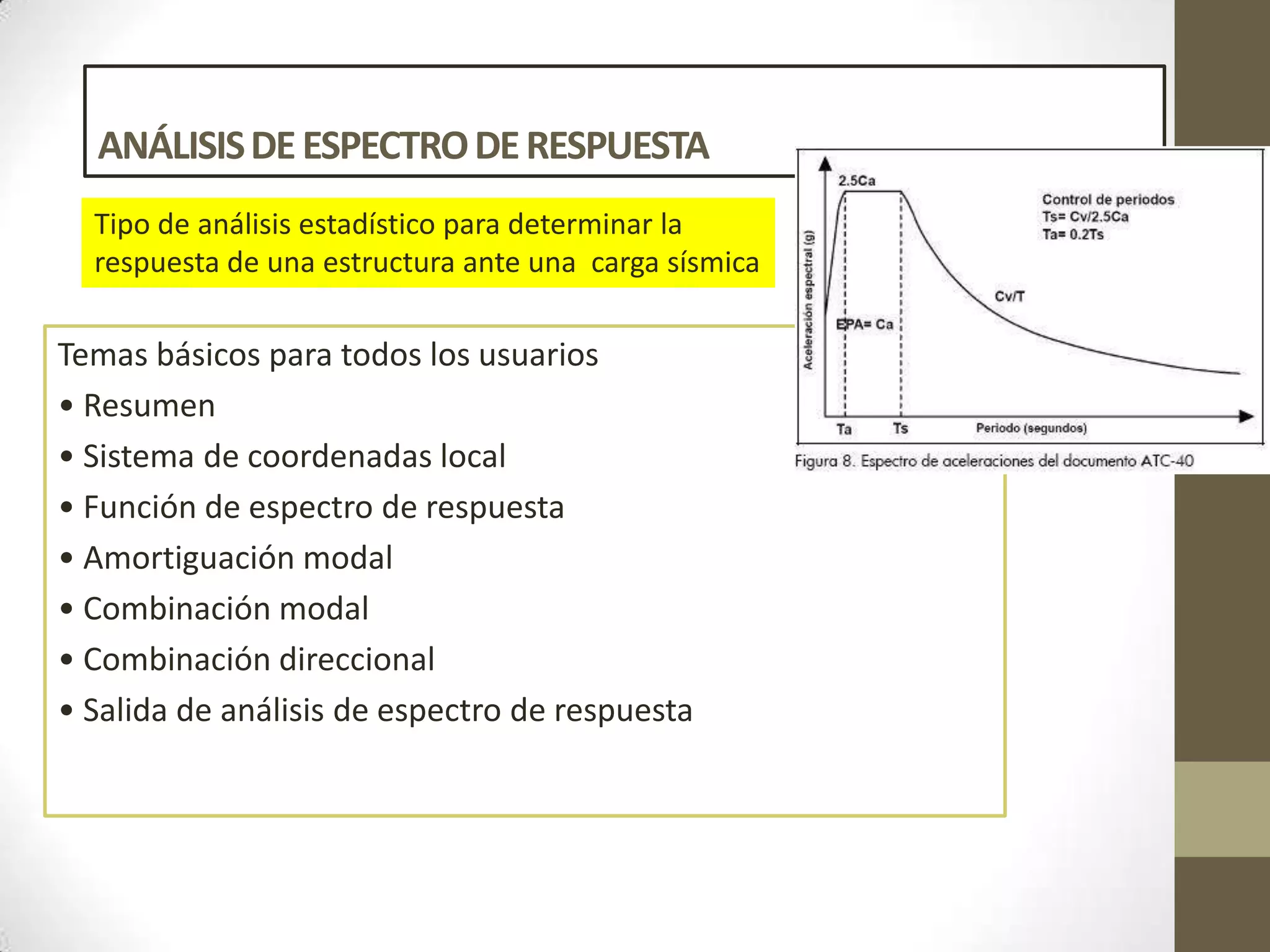 Este documento describe el análisis de espectro de respuesta realizado para el diseño de un puente como parte de un proyecto de ingeniería civil en la Universidad Técnica de Ambato en Ecuador. El análisis determina la respuesta de la estructura ante una carga sísmica y cubre temas como el sistema de coordenadas, la función de espectro de respuesta, la amortiguación modal y la combinación modal y direccional.