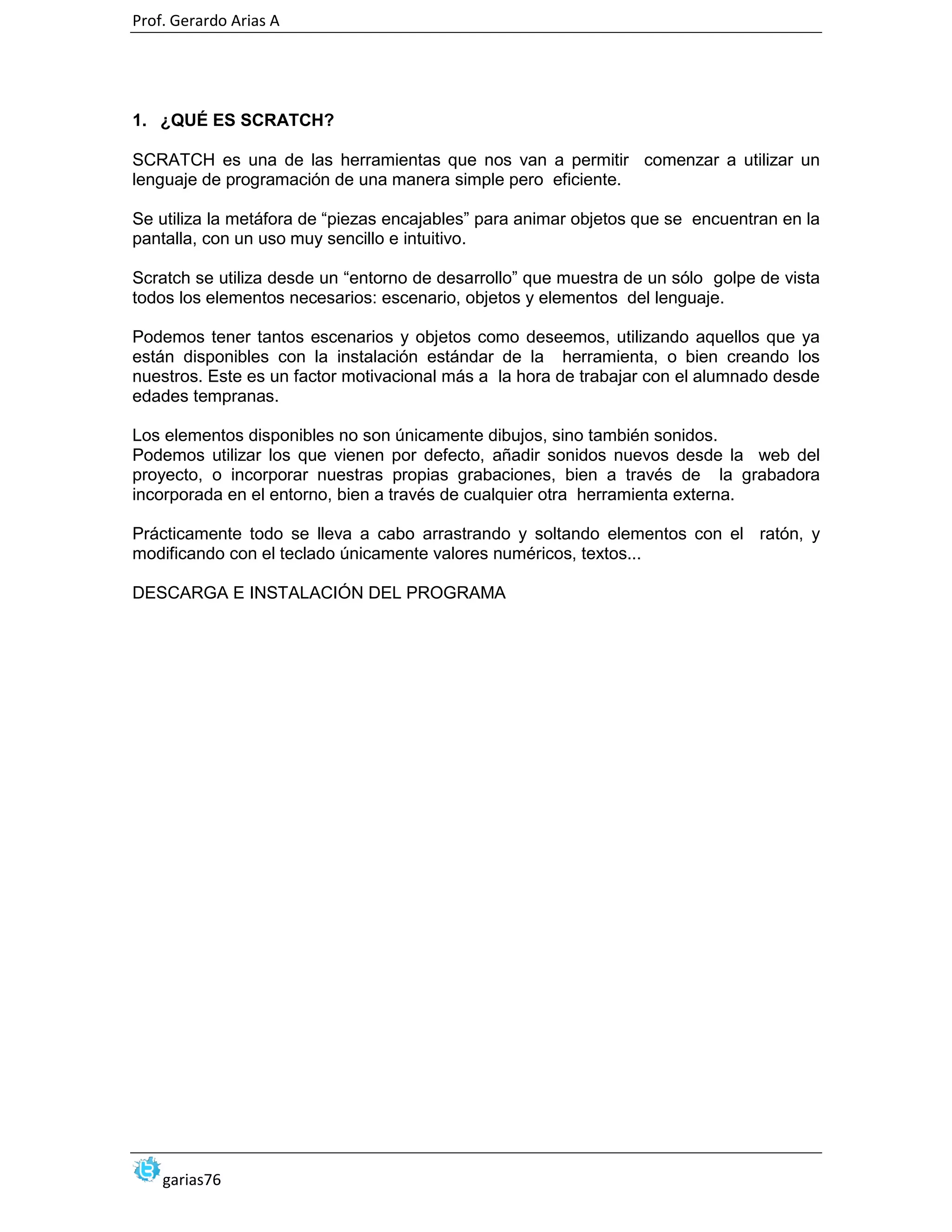 Este documento proporciona una introducción al programa de programación Scratch. Explica lo que es Scratch, cómo descargar e instalar el programa, y describe la interfaz de usuario, incluyendo el escenario, objetos, bloques de programación, disfraces y sonidos. También explica cómo crear y editar proyectos de Scratch.