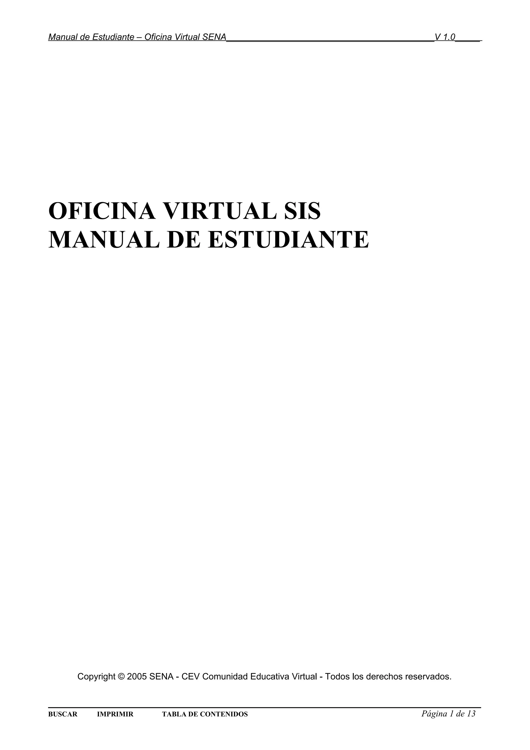 Este documento presenta el manual de estudiante para la Oficina Virtual SIS del SENA. Explica que la Oficina Virtual permite realizar procesos administrativos relacionados con la formación virtual y muestra información de cursos e inscripciones. Describe las secciones de la Oficina Virtual, cómo usar las herramientas de forma secuencial y cómo ingresar, consultar certificaciones y usar herramientas como cambiar correo y contraseña.